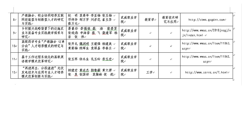 根據(jù)甘肅省人力資源和社會保障廳、甘肅省教育廳《關(guān)于開展2018年甘肅省職業(yè)教育教學(xué)成果獎評選表彰工作的通知》精神,經(jīng)個人申報,學(xué)院審核,決定擬推薦以下所提交紙質(zhì)材料、電子材料、申報網(wǎng)站等符合申報要求的12項教學(xué)成果參評2018年甘肅省職業(yè)教育教學(xué)成果獎,現(xiàn)予以公示。