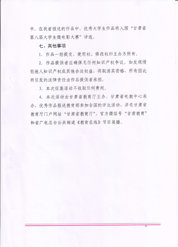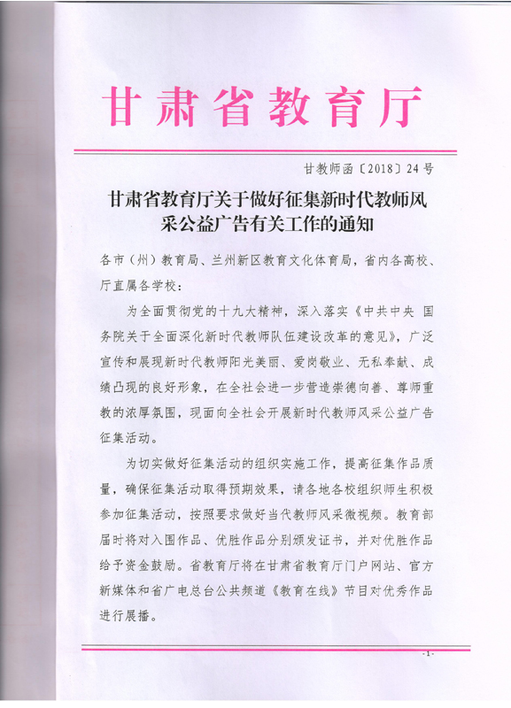 ???? 現(xiàn)將甘肅省教育廳《甘肅省教育廳關于做好征集新時代教師風采公益廣告有關工作的通知》(甘教師函〔2018〕24號)轉發(fā)你們,請各部門、單位根據(jù)通知要求認真組織,積極參與。將參賽作品于5月15日前報宣傳統(tǒng)戰(zhàn)部辦公室,宣傳統(tǒng)戰(zhàn)部對報送作品匯總后統(tǒng)一報送省教育廳電教中心。