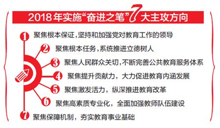 陳寶生指出,黨的十九大對(duì)教育工作作出了全面系統(tǒng)部署。在加快教育現(xiàn)代化、建設(shè)教育強(qiáng)國(guó)的新征程中,解決教育發(fā)展不平衡不充分的問題將是我們長(zhǎng)期要面對(duì)的工作主題。要以問題為導(dǎo)向,將其作為實(shí)施“奮進(jìn)之筆”的著力點(diǎn)和主攻方向。一是聚焦根本保證,堅(jiān)持和加強(qiáng)黨對(duì)教育工作的領(lǐng)導(dǎo)。要把黨的政治建設(shè)擺在首位,狠抓大抓基層黨組織建設(shè),持之以恒正風(fēng)肅紀(jì),抓好意識(shí)形態(tài)工作。二是聚焦根本任務(wù),系統(tǒng)推進(jìn)立德樹人。要把德育擺在更加重要的位置,堅(jiān)定青少年理想信念,改進(jìn)和加強(qiáng)思想政治工作,大力發(fā)展素質(zhì)教育,加強(qiáng)語言文字工作。三是聚焦人民群眾關(guān)切,不斷完善公共教育服務(wù)體系。要促進(jìn)學(xué)前教育普惠健康發(fā)展,加快城鄉(xiāng)義務(wù)教育一體化發(fā)展步伐,加大普及高中階段教育攻堅(jiān)力度,加大對(duì)困難地區(qū)扶持力度,切實(shí)加強(qiáng)校園安全。四是聚焦提升貢獻(xiàn)力,大力促進(jìn)教育內(nèi)涵發(fā)展。要以質(zhì)量為本,持續(xù)推進(jìn)職業(yè)教育質(zhì)量提升,健全高等教育內(nèi)涵發(fā)展政策機(jī)制,辦好繼續(xù)教育。五是聚焦激發(fā)活力,縱深推進(jìn)教育改革。要深化“放管服”改革,實(shí)施考招改革“拓展深化”攻堅(jiān)行動(dòng),支持和規(guī)范社會(huì)力量興辦教育,堅(jiān)定不移以開放促改革。六是聚焦高素質(zhì)專業(yè)化,全面加強(qiáng)教師隊(duì)伍建設(shè)。實(shí)施教師隊(duì)伍“建設(shè)改革”攻堅(jiān)行動(dòng),健全師德師風(fēng)建設(shè)長(zhǎng)效機(jī)制,完善教師管理制度,提升教師獲得感、幸福感和榮譽(yù)感。七是聚焦保障機(jī)制,夯實(shí)教育事業(yè)基礎(chǔ)。要落實(shí)教育投入責(zé)任,加快教育信息化步伐,全力推進(jìn)依法治教。
