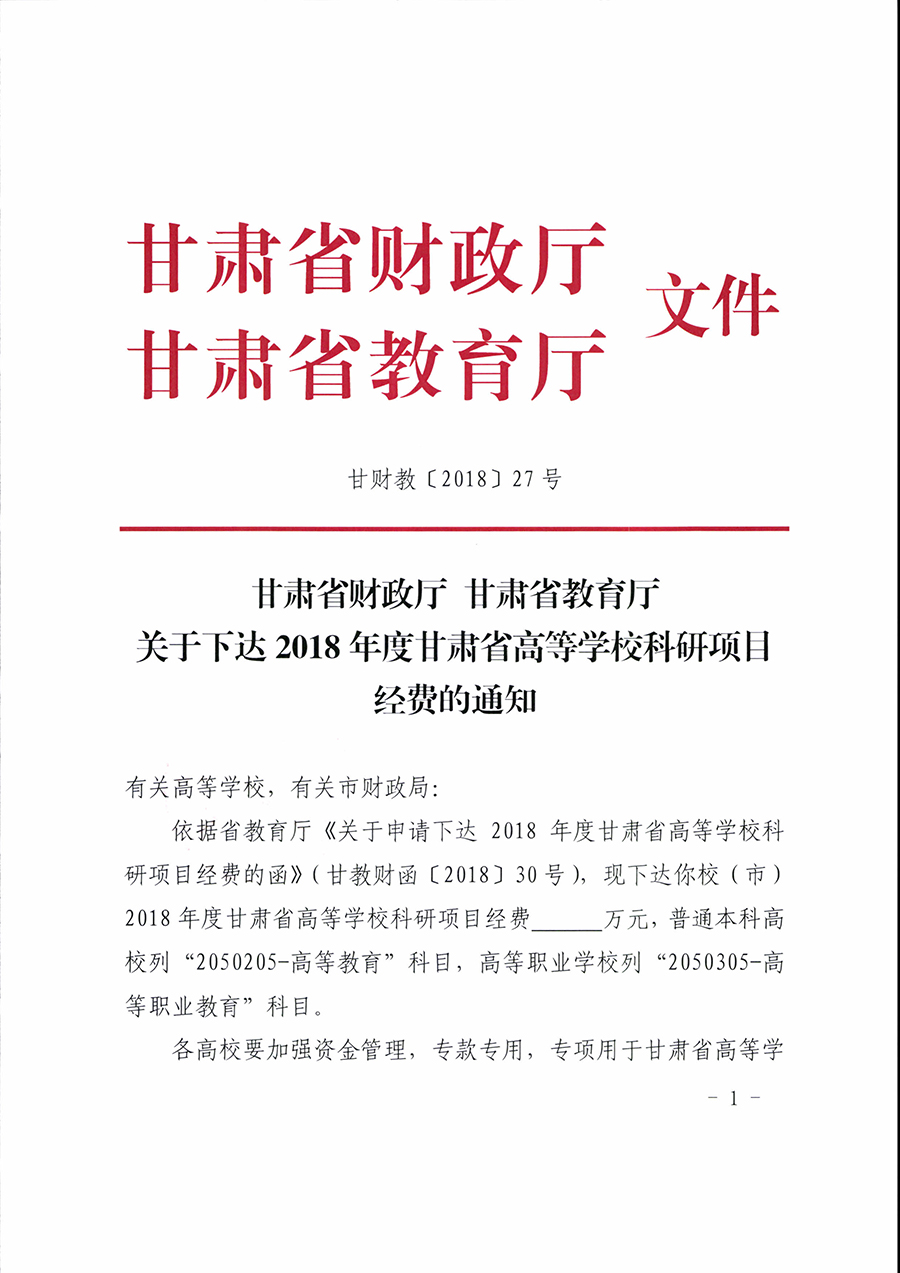 甘肅省財政廳 甘肅省教育廳關(guān)于下達2018年度甘肅省高等學??蒲许椖拷?jīng)費的通知.rar