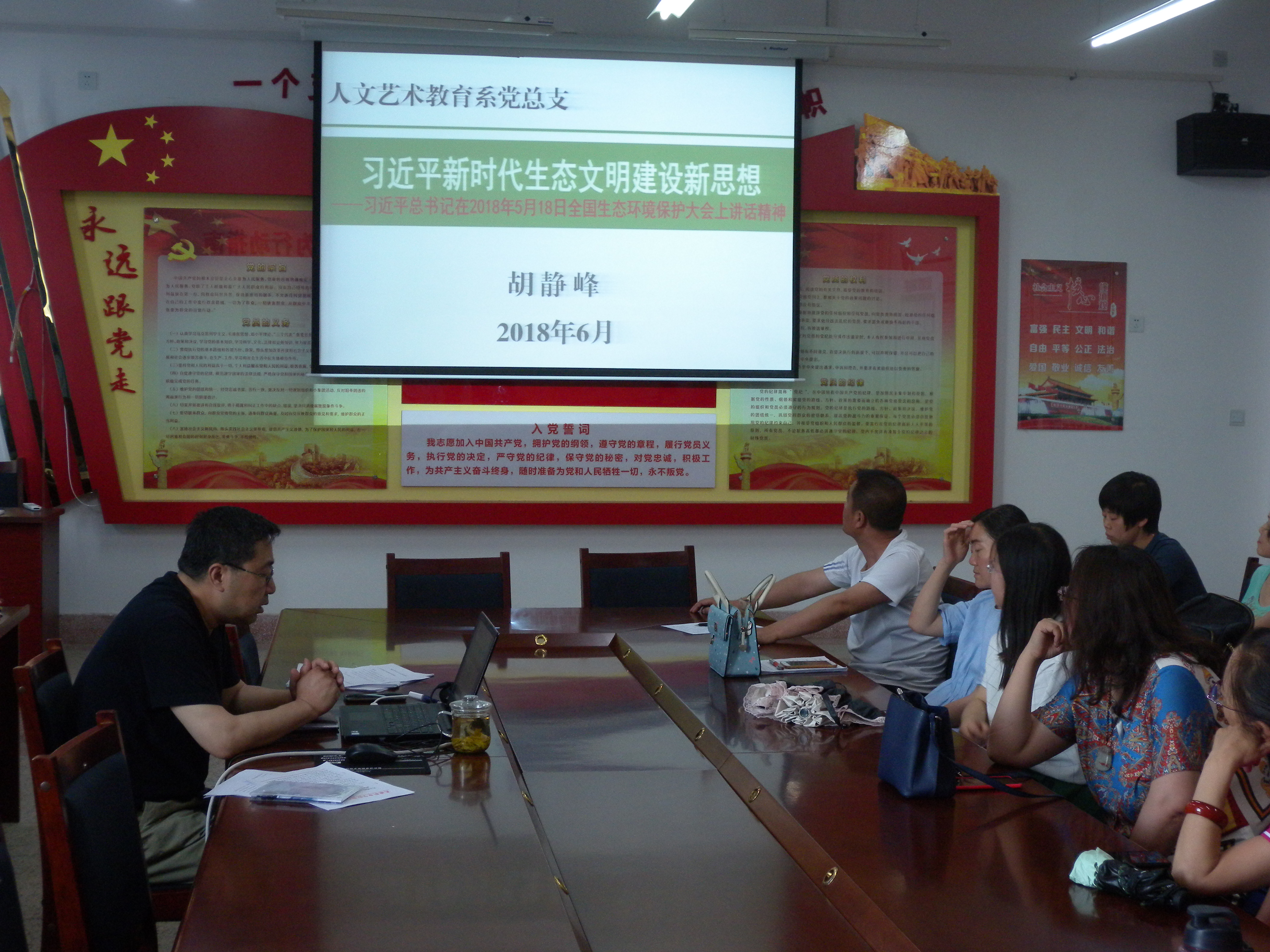 為深入學(xué)習(xí)習(xí)近平新時(shí)代中國(guó)特色社會(huì)主義思想,人文藝術(shù)教育系黨總支于6月13日下午在勵(lì)勤樓209黨員活動(dòng)室開(kāi)展書(shū)記講黨課活動(dòng)。黨課由系黨總支書(shū)記胡靜峰主講,題目為《習(xí)近平新時(shí)代生態(tài)文明建設(shè)新思想》,系全體黨員參加了此次活動(dòng)。