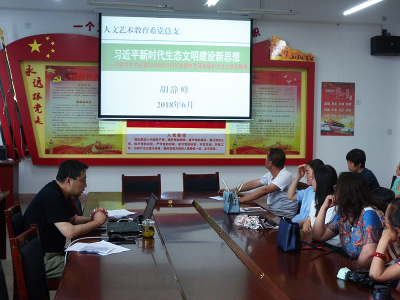 ?? 為深入學(xué)習(xí)習(xí)近平新時(shí)代中國(guó)特色社會(huì)主義思想,人文藝術(shù)教育系黨總支于6月13日下午在勵(lì)勤樓209黨員活動(dòng)室開展書記講黨課活動(dòng)。黨課由系黨總支書記胡靜峰主講,題目為《習(xí)近平新時(shí)代生態(tài)文明建設(shè)新思想》,系全體黨員參加了此次活動(dòng)。