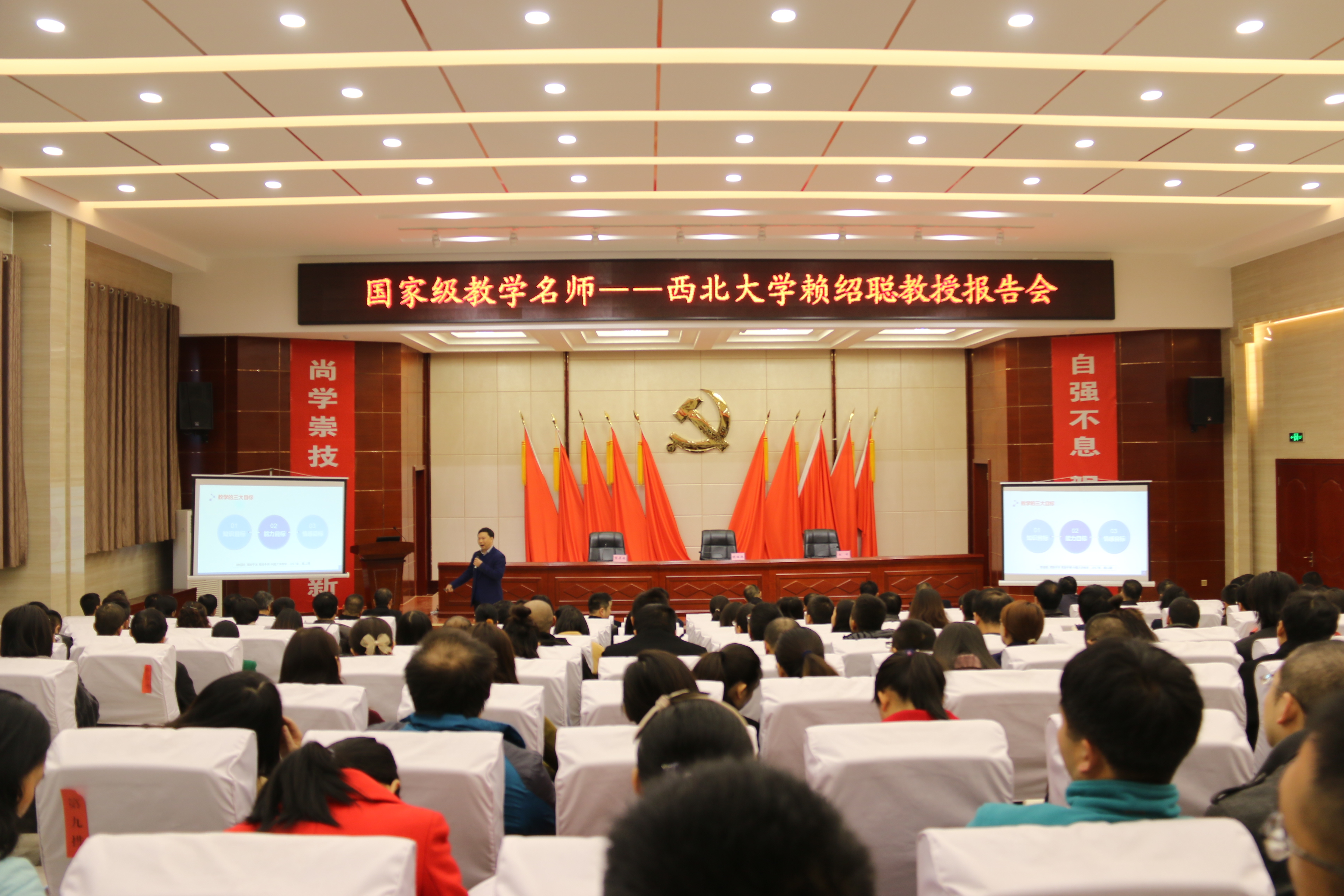 11月11日上午,西北地區(qū)高校教師教學(xué)發(fā)展中心聯(lián)盟“名師西部高校行”走進(jìn)我院。國(guó)家級(jí)教學(xué)名師、西北大學(xué)副校長(zhǎng)賴紹聰教授作題為“如何做好課程教學(xué)設(shè)計(jì)”的專題報(bào)告。聯(lián)盟執(zhí)行秘書(shū)長(zhǎng)、西安交通大學(xué)教師教學(xué)發(fā)展中心專家吉康敏參加了報(bào)告會(huì),報(bào)告會(huì)由學(xué)院黨委書(shū)記、院長(zhǎng)趙明教授主持。