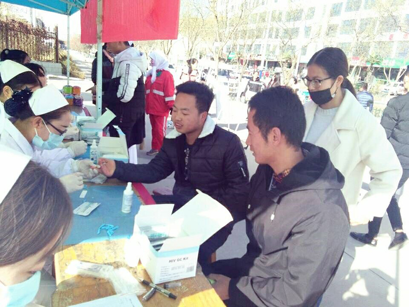 11月17日開始利用周末時間在武威文化廣場、武威職業(yè)學(xué)院門口等地開展了免費檢測艾滋病與知艾防艾知識宣傳活動?;顒游藦V大師生及路人,組織井然有序,活動場面顯得忙而不亂。在護(hù)理系紅絲帶協(xié)會志愿者與武威市疾控中心人員嫻熟的操作下,通過指尖采血,HIV病毒膠體金法檢測,共檢測了80余人,檢測速度快,精準(zhǔn)度高。檢測結(jié)束后,向檢測者贈送活動宣傳紀(jì)念品。此次檢測活動采取保密制,保護(hù)檢測者的一切信息。
