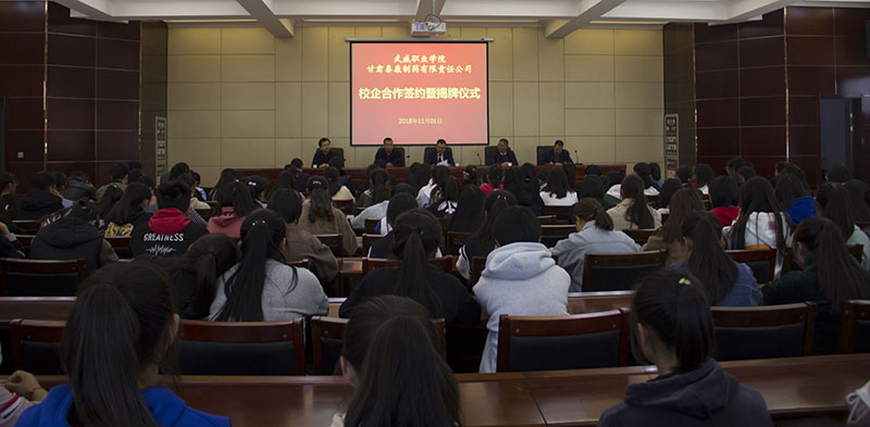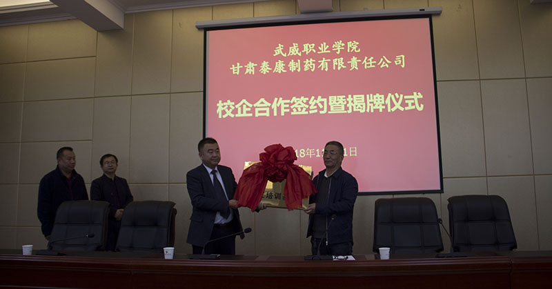 為提高人才培養(yǎng)質(zhì)量和辦學(xué)水平,加強校企協(xié)同育人機制建設(shè),11月1日下午,藥學(xué)系與甘肅泰康制藥有限責(zé)任公司校企合作共建“就業(yè)實習(xí)基地”簽約揭牌儀式在行樹樓北側(cè)會議室隆重舉行。甘肅泰康制藥有限責(zé)任公司投資方—北京久朝集團產(chǎn)業(yè)中心總監(jiān)楊宏超、公司總工程師毛著鴻、財務(wù)總監(jiān)郝敏等企業(yè)領(lǐng)導(dǎo)出席本次儀式。學(xué)院教務(wù)處處長仲生仁、招生就業(yè)處處長蔡柱山、藥學(xué)系主任魏潤明、副主任楊建美、黨總支副書記單光年及藥學(xué)系160余名師生參加了此次簽約揭牌儀式。儀式由魏潤明主持。