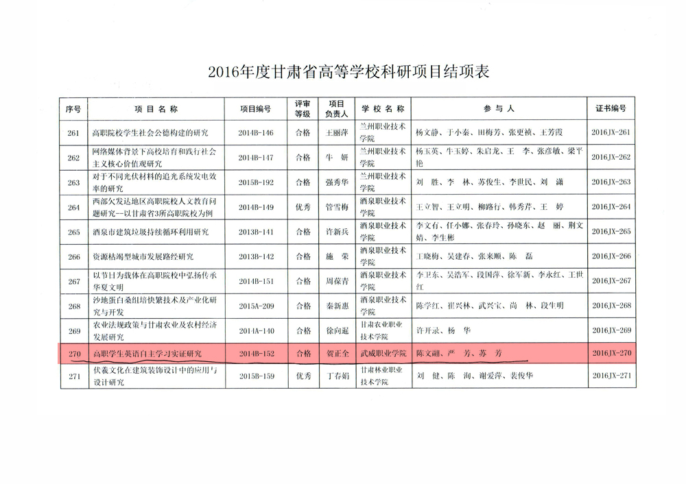 轉(zhuǎn)發(fā)甘肅省教育廳關(guān)于2016年度甘肅省高等學??蒲许椖拷Y(jié)項情況的通知