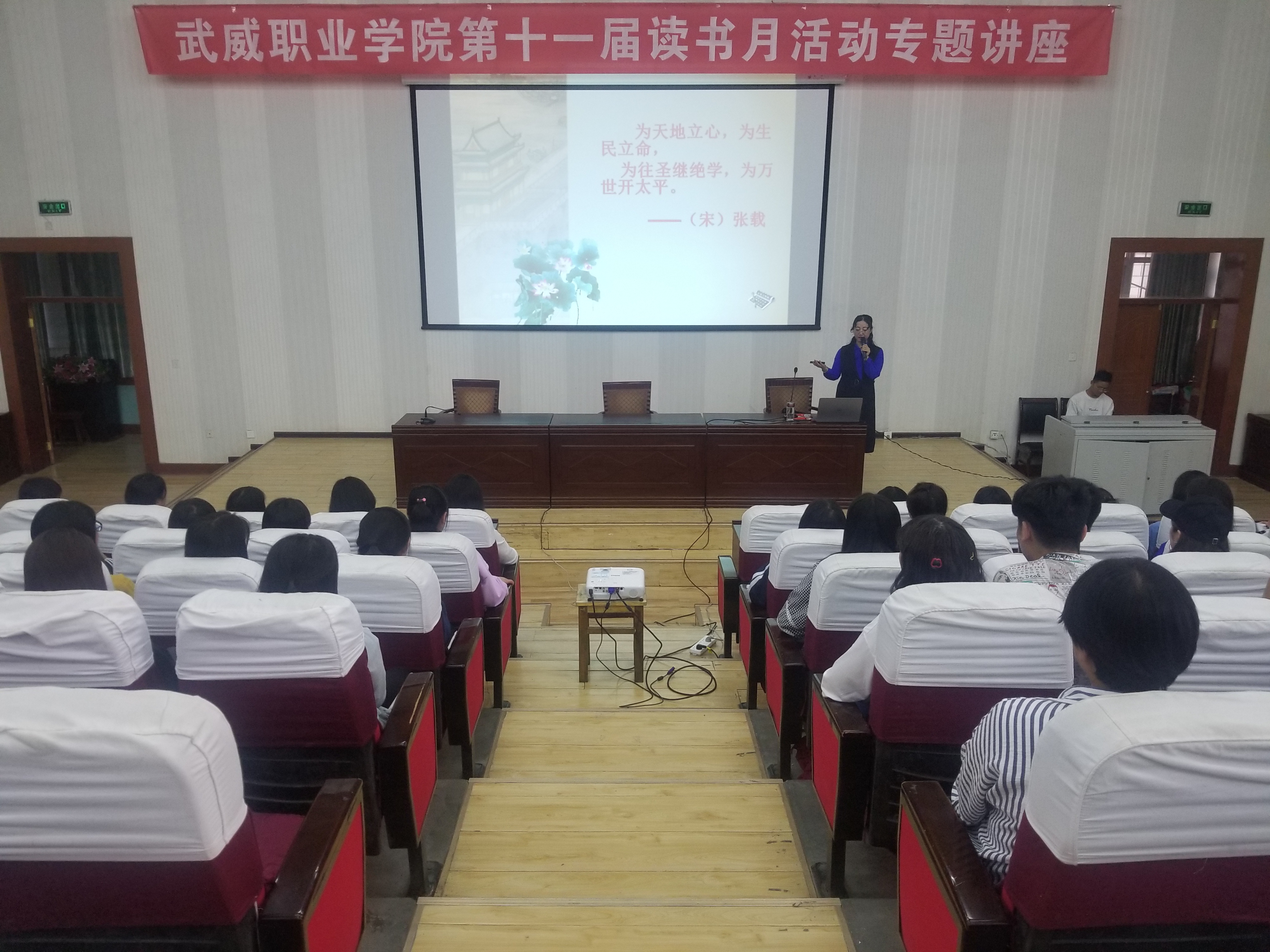 武威職業(yè)學(xué)院第十一屆讀書月活動(dòng)專題講座在正德廳舉行。4月24日學(xué)院中文專業(yè)教授趙穎老師應(yīng)邀進(jìn)行了《走進(jìn)國學(xué)》的專題講座,近300名師生參加了此次講座。