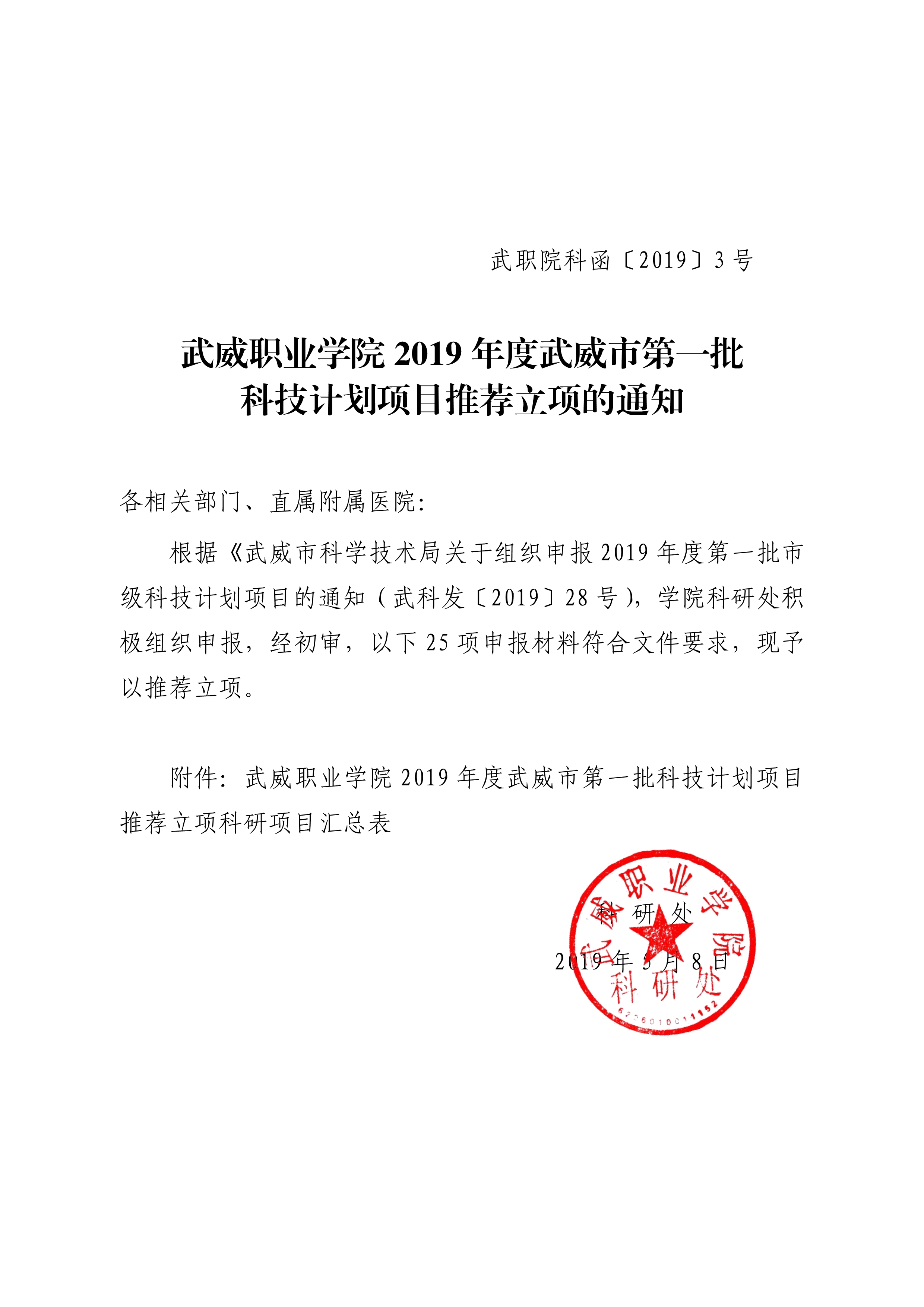武威職業(yè)學院2019年度武威市第一批科技計劃項目推薦立項的通知