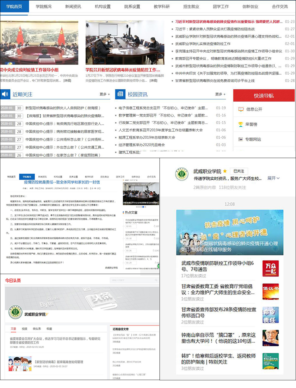 學(xué)院通過網(wǎng)站、微信公眾號、隴政釘、微信群、QQ群等平臺,第一時間刊載轉(zhuǎn)發(fā)習(xí)近平總書記重要指示、李克強(qiáng)總理批示,中共中央、教育部、省委、省教育工委、武威市委關(guān)于做好新型冠狀病毒感染肺炎疫情防控工作的重要會議、文件、通知以及《武威職業(yè)學(xué)院致全體同學(xué)和家長的一封信》《中共武威職業(yè)學(xué)院委員會致學(xué)院各基層黨組織和廣大共產(chǎn)黨員的倡議書》和防控知識50多條;做到宣傳教育和正面引導(dǎo)覆蓋到每一位教師、每一個班級、每一位學(xué)生,確保師生和學(xué)生家長及時了解疫情發(fā)展態(tài)勢、臨床癥狀和學(xué)習(xí)掌握防控知識;做到科學(xué)認(rèn)識、理性判斷、合理應(yīng)對,不信謠、不傳謠,養(yǎng)成健康的防控生活習(xí)慣,堅(jiān)定信心、眾志成城防控疫情、戰(zhàn)勝疫情。
