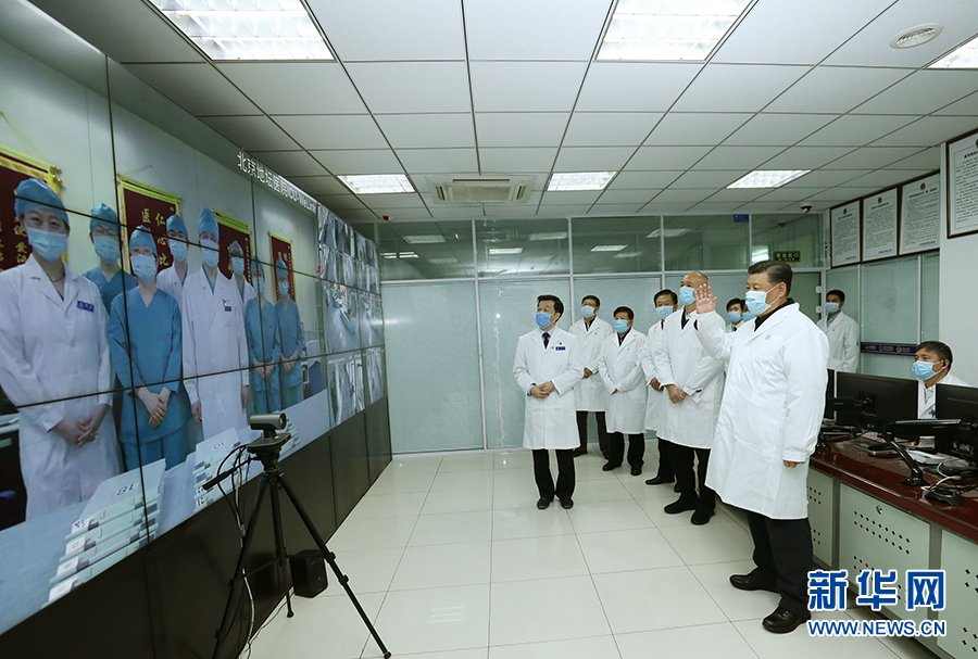 2月10日,中共中央總書記、國家主席、中央軍委主席習(xí)近平在北京調(diào)研指導(dǎo)新冠肺炎疫情防控工作。這是習(xí)近平來到首都醫(yī)科大學(xué)附屬北京地壇醫(yī)院門診樓一層運(yùn)行監(jiān)控中心,通過監(jiān)控畫面察看患者住院診療情況,并視頻連線正在病房值班的醫(yī)務(wù)人員。 新華社記者 謝環(huán)馳 攝