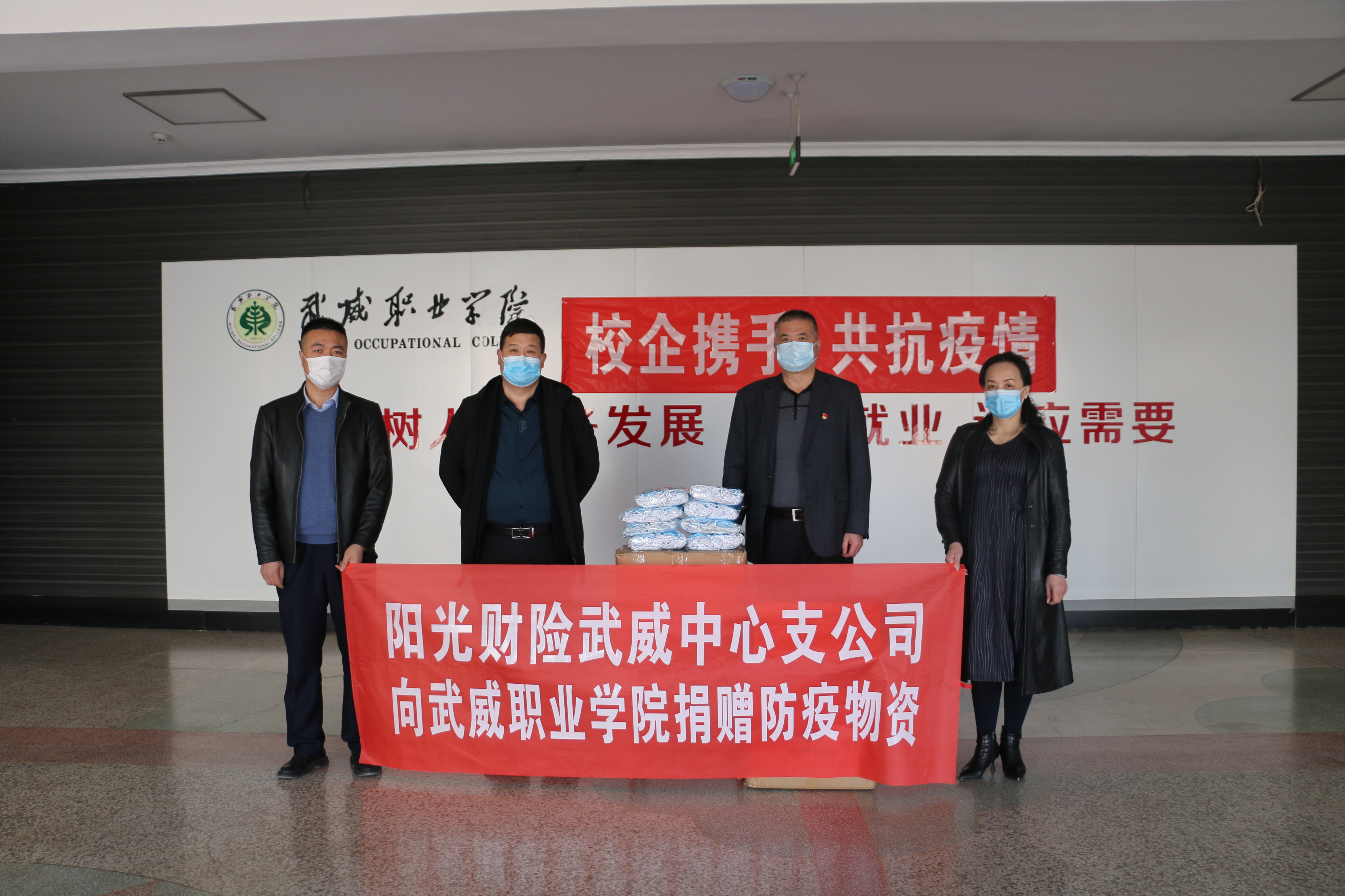 3月16日下午,陽光財產(chǎn)保險股份有限公司武威中心支公司向?qū)W院捐贈愛心防疫物資儀式在行樹樓大廳舉行,學(xué)院副院長王守云、陽光財產(chǎn)保險股份有限公司武威中心支公司總經(jīng)理崔生輝、學(xué)院后勤處負責(zé)同志參加捐贈活動。
