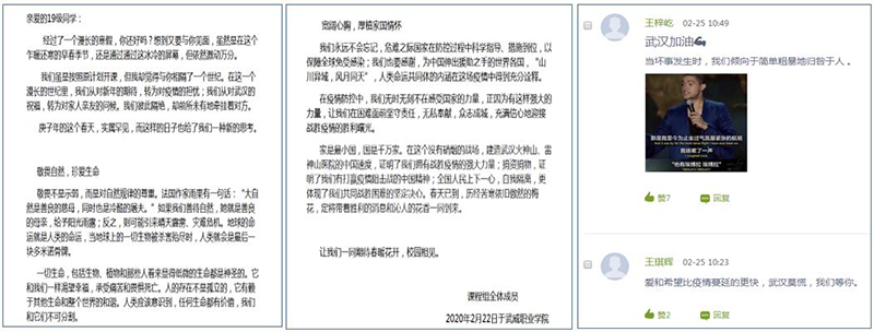 《中華優(yōu)秀傳統(tǒng)文化》課程團隊的馮文娟老師在開學(xué)第一天借助在線教學(xué)平臺向?qū)W生推送了《致2019級學(xué)生的一封信》,激勵學(xué)生要敬畏自然、珍愛生命,致敬英雄、感恩榜樣,寬闊心胸、厚植家國情懷。信中這樣寫道:“在疫情防控中,我們無時無刻不在感受國家的力量,正因為有這樣強大的力量,讓我們在困難面前堅守責(zé)任,無私奉獻,眾志成城,充滿信心地迎接戰(zhàn)勝疫情的勝利曙光。”“ 家是最小國,國是千萬家。在這個沒有硝煙的戰(zhàn)場,建造武漢火神山、雷神山醫(yī)院的中國速度,證明了我們擁有戰(zhàn)勝疫情的強大力量;捐資捐物,證明了我們有打贏疫情阻擊戰(zhàn)的中國精神;全國人民上下一心,自我隔離,更體現(xiàn)了我們共同戰(zhàn)勝困難的堅定決心。春天已到,歷經(jīng)苦寒依舊傲然的梅花,定將帶著勝利的消息和沁人的花香一同到來?!蓖瑫r,為學(xué)生推送由央視頻和有道精品課共同錄制的《面對疫情教你如何有效防范》疫情防控專題視頻,與學(xué)生一起為打贏新冠肺炎疫情防控阻擊戰(zhàn)貢獻力量。