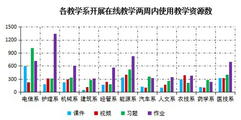 根據(jù)學(xué)院教學(xué)平臺管理數(shù)據(jù)和各教學(xué)系反饋數(shù)據(jù),開課兩周內(nèi)全院開展在線教學(xué)教師共有263人,開設(shè)課程284門;學(xué)院兩周內(nèi)授課課時總數(shù)達到1949學(xué)時,教師開展在線教學(xué)3334人次;發(fā)布作業(yè)共計1306次,組織答疑討論1918次。教師教學(xué)形式靈活多樣,對教學(xué)平臺及教學(xué)工具的熟練程度逐漸提升,教師討論交流的主題從基礎(chǔ)性的上傳資源、組織教學(xué)、組織教學(xué)等轉(zhuǎn)變?yōu)樽鳂I(yè)發(fā)布、主題討論、學(xué)情數(shù)據(jù)分析,在線教學(xué)工作步入正軌。