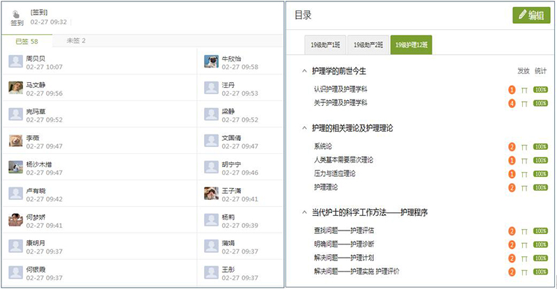 根據(jù)教學(xué)實際,護理制定了線上教學(xué)工作方案,對線上教學(xué)工作做出統(tǒng)一安排,強調(diào)了線上教學(xué)督導(dǎo)、任課教師和班主任的具體工作職責(zé)。2月24日,各項教學(xué)工作有序開展。共24名教師完成 11門課程的在線教學(xué)任務(wù),主要依托學(xué)院在線教學(xué)平臺、中國大學(xué)MOOC、人衛(wèi)慕課、智慧職教平臺上完成授課,上課學(xué)生1510人。通過多層次多方位的監(jiān)控數(shù)據(jù)分析,全系在線教學(xué)整體運行平穩(wěn)有序,管理人員組織管理到位,教師盡職盡責(zé),課堂授課方式靈活多樣,學(xué)生積極互動,在線教學(xué)課堂效果良好,達到預(yù)期。學(xué)生平均到課率達到99%以上,積極落實了在線教學(xué)對學(xué)生“全覆蓋”的要求。教師在教學(xué)平臺上完成視頻、電子教材、PPT等資源上傳,積極開展課前預(yù)習(xí)、主題討論、隨堂測驗、作業(yè)布置等各類線上課堂教學(xué)活動,充分調(diào)動學(xué)生的學(xué)習(xí)主動性,學(xué)習(xí)效果良好。