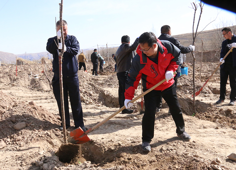 春風(fēng)吹拂處,新綠綻枝頭。為深入學(xué)習(xí)貫徹習(xí)近平總書記視察甘肅的重要講話和批示精神,認(rèn)真踐行綠水青山就是金山銀山的發(fā)展理念,實施綠色發(fā)展戰(zhàn)略,進一步加強祁連山生態(tài)環(huán)境保護與治理,幫助幫扶鎮(zhèn)打贏脫貧攻堅戰(zhàn),實施鄉(xiāng)村振興戰(zhàn)略,4月9日,學(xué)院領(lǐng)導(dǎo)班子成員、幫扶干部、駐村干部及部分教職工70多人深入結(jié)對幫扶鎮(zhèn)——黑松驛鎮(zhèn)開展義務(wù)植樹活動,建設(shè)“生態(tài)示范林”。春光沐浴的祁連山腳下黑松驛鎮(zhèn),春意盎然,生機勃勃,正是植樹好時節(jié)。廣大教職工一下車就拿起鐵鍬到植樹現(xiàn)場,與黑松驛鎮(zhèn)政府部分干部一起投入植樹活動,按照“橫看直線側(cè)一線、三埋兩踩一提苗”的技術(shù)要求,三人一組,分工協(xié)作,有序配合,揮鍬培土、扶苖踩土、圍堰澆水,現(xiàn)場一派熱火朝天的勞動景象。當(dāng)天植樹育林約20余畝,一棵棵新栽的樹苗整齊排列,迎風(fēng)挺立。通過義務(wù)植樹,廣大教職工用實際行動傳播著生態(tài)文明、綠色發(fā)展理念,切實幫助幫扶鎮(zhèn)綠起來,美起來,富起來。