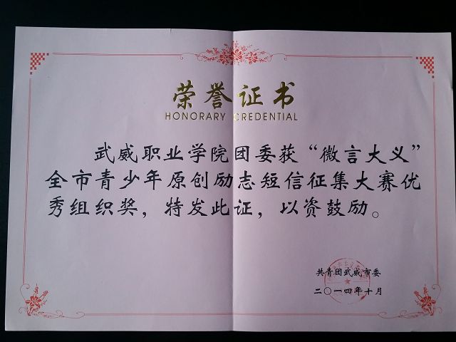 近日,由武威團(tuán)市委舉辦的武威市“微言大義”青少年原創(chuàng)勵(lì)志短信征集大賽圓滿結(jié)束,我院郝金秀同學(xué)榮獲一等獎(jiǎng),李志強(qiáng)、于婷等4名同學(xué)榮獲二等獎(jiǎng),尉杰靈、陳對麗等3名同學(xué)榮獲三等獎(jiǎng),羅曉飛、楊彩玲等7名同學(xué)榮獲優(yōu)秀獎(jiǎng),學(xué)院團(tuán)委榮獲優(yōu)秀組織獎(jiǎng)。