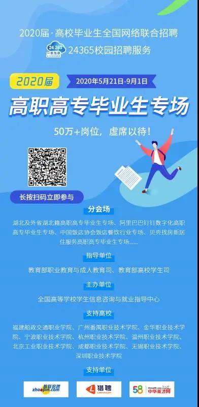 為了進(jìn)一步促進(jìn)2020屆高職高專畢業(yè)生就業(yè),教育部高校學(xué)生司和職業(yè)教育與成人教育司聯(lián)合推出“高職高專畢業(yè)生專場(chǎng)招聘會(huì)”,首批推出崗位超過50萬個(gè)。畢業(yè)生可登錄教育部大學(xué)生就業(yè)網(wǎng)(新職業(yè)網(wǎng)www.ncss.cn)或直接掃描宣傳頁中的二維碼參與活動(dòng)。