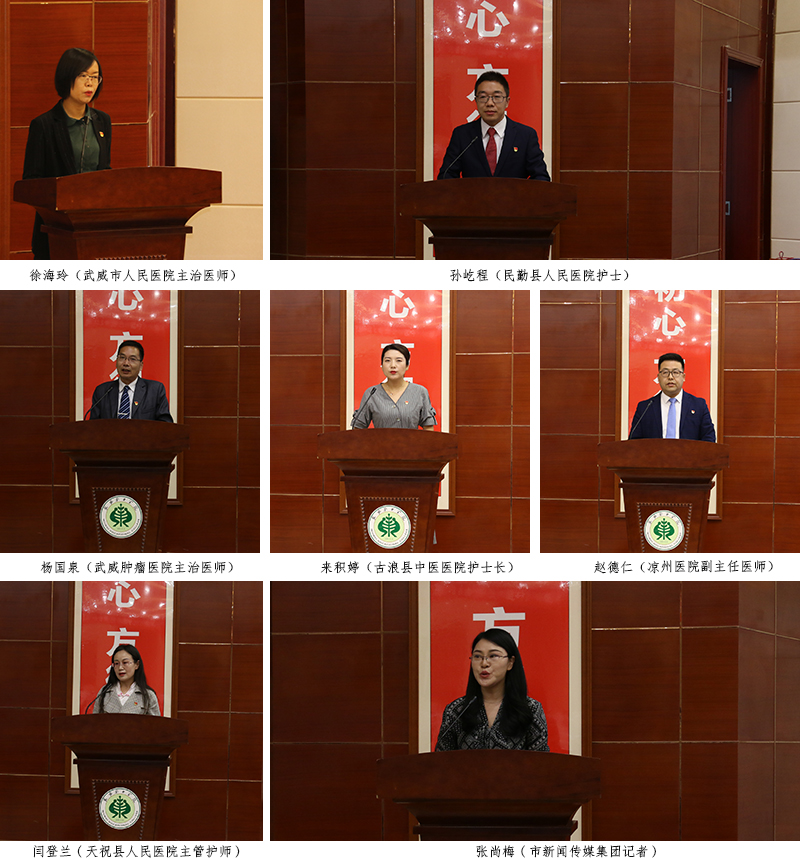 宣講報告團成員由6位援鄂優(yōu)秀隊員代表和市新聞傳媒集團的1位記者組成。宣講會上,武威市人民醫(yī)院主治醫(yī)師徐海玲、民勤縣人民醫(yī)院護士孫屹程、武威腫瘤醫(yī)院主治醫(yī)師楊國泉、古浪縣中醫(yī)醫(yī)院護士長來積婷、涼州醫(yī)院副主任醫(yī)師趙德仁、天??h人民醫(yī)院主管護師閆登蘭,市新聞傳媒集團記者張尚梅,用自己的親身經(jīng)歷和樸實生動的語言,從主動請戰(zhàn)、逆行出征、克服困難、參與救治、關愛患者、勝利歸來等多個方面,滿懷深情地講述了他們在支援湖北期間的難忘瞬間與暖心經(jīng)歷。他們用實際行動譜寫了一曲感天動地的英雄贊歌,生動詮釋了新時代武威精神,是武威人民的優(yōu)秀兒女,是當之無愧的“白衣戰(zhàn)士”、“最美逆行者”和“新時代最可愛的人”。會場不時響起如雷的掌聲。武威援鄂醫(yī)療隊全體成員以強烈的使命感和責任感,堅持奮戰(zhàn)在抗擊疫情的最前沿,展現(xiàn)了崇高的使命擔當,樹立了新時代的典型榜樣。