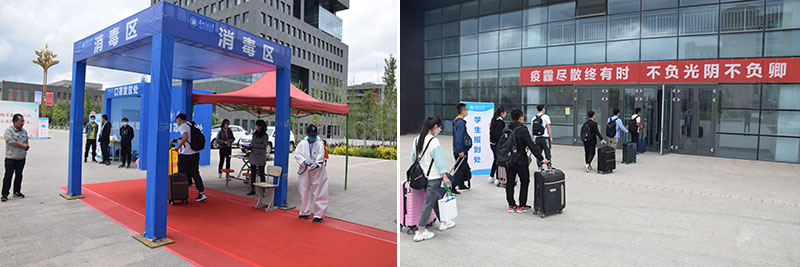 學(xué)院在校門口設(shè)置了測溫通道,消毒區(qū)、口罩發(fā)放區(qū)、臨時觀察區(qū)等,為同學(xué)們的健康安全保駕護航。學(xué)生到校后,依次通過測溫區(qū)、消毒區(qū),經(jīng)工作人員嚴格的測溫和消毒后,更換口罩到指定地點報到。