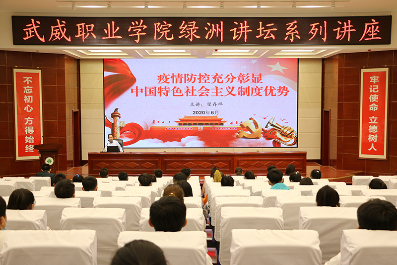 6月9日,武威職業(yè)學(xué)院“綠洲講壇”第33期在學(xué)院菁英廳舉行,學(xué)院黨委副書記翟存祥教授作了題為《疫情防控充分彰顯中國特色社會(huì)主義制度優(yōu)勢(shì)》的講座。中科低碳新能源技術(shù)學(xué)院師生代表共150余人參加了報(bào)告會(huì)。