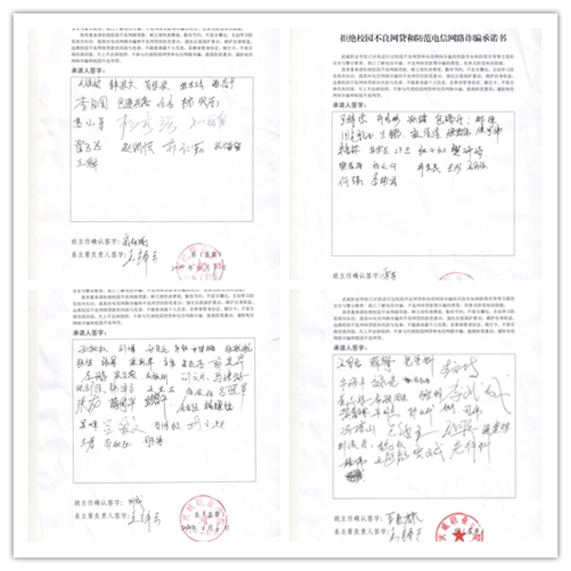 ??對學生進行校園不良網(wǎng)貸和電信網(wǎng)絡詐騙的風險告知和防范引導等方面的安全與警示教育,讓學生了解電信詐騙、不良網(wǎng)絡貸款等詐騙的類型、危害及防范知識技能。自愿簽訂拒絕不良網(wǎng)貸和防范電信網(wǎng)絡詐騙承諾書。