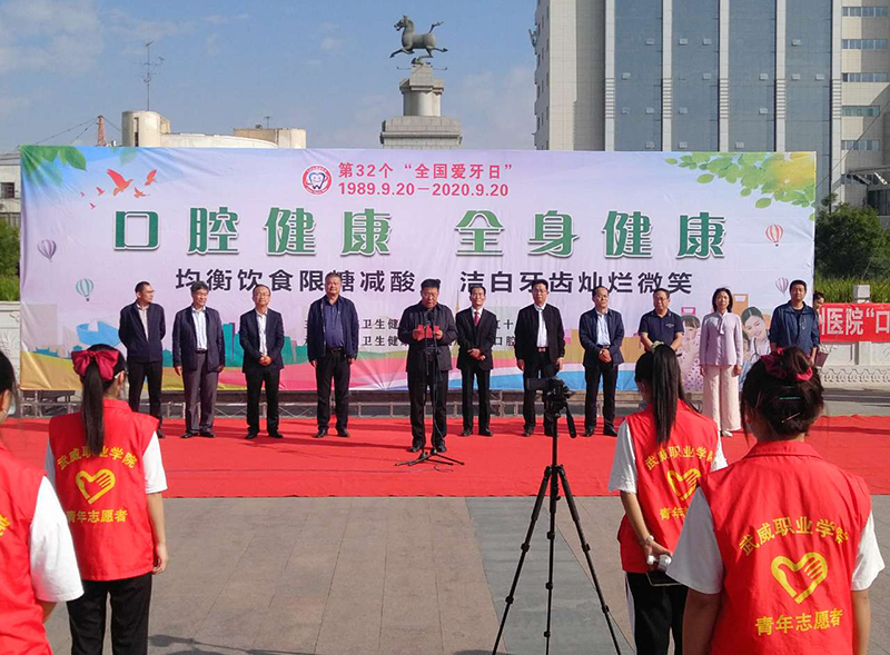 2020年9月20日是第32個“全國愛牙日”,為進一步普及口腔健康知識,結合今年全國愛牙日“口腔健康,全身健康”的主題,9月20日上午,由武威市衛(wèi)生健康委員會、武威市紅十字協(xié)會牽頭在文化廣場組織開展了“9.20全國愛牙日”主題宣傳活動。學院黨委委員、副院長王守云、醫(yī)學技術學院黨總支書記黃文源及醫(yī)學技術學院100多名口腔醫(yī)學技術專業(yè)學生參加了志愿服務活動。