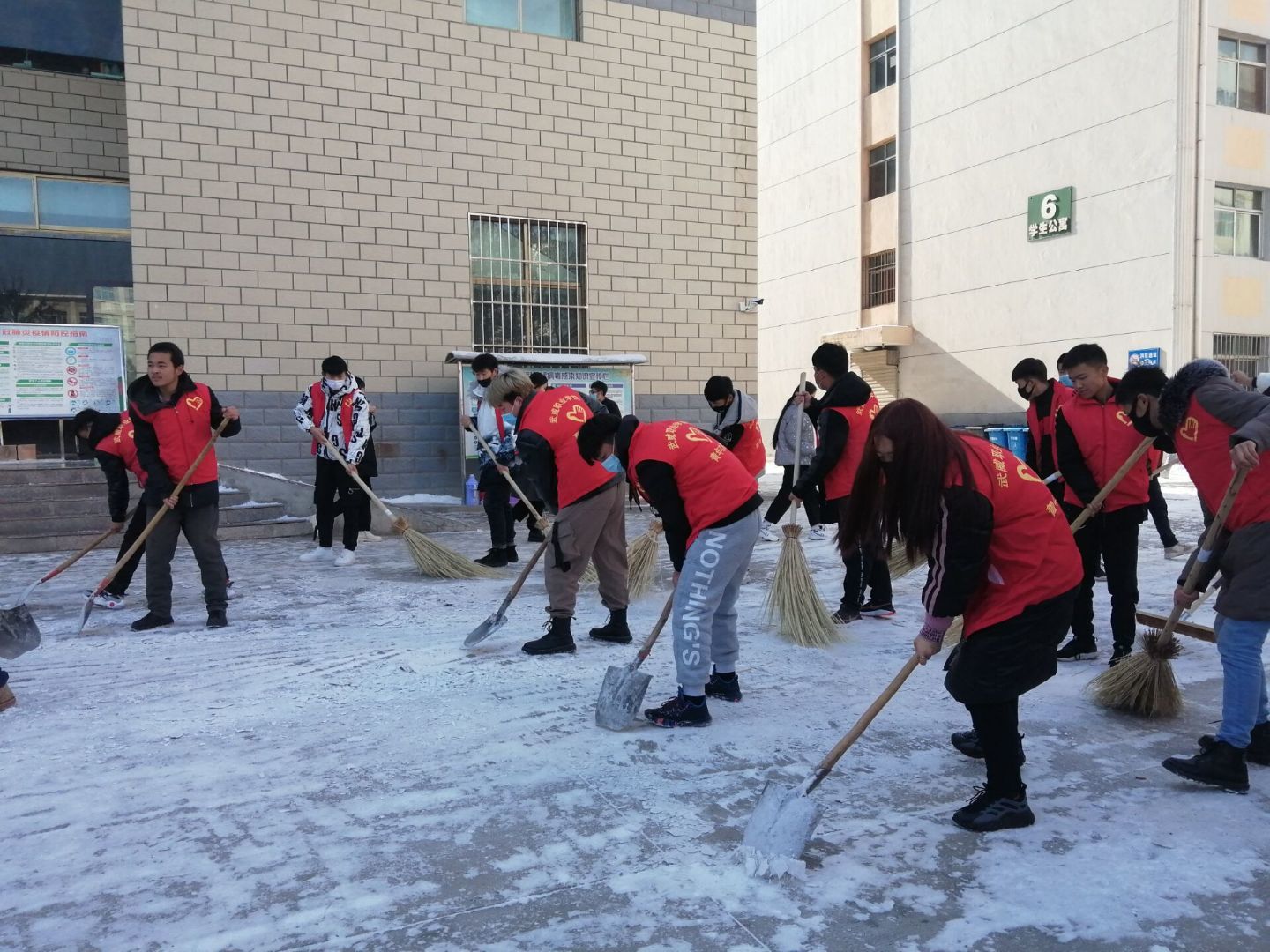 本次鏟雪的區(qū)域是教學樓區(qū)域的主干道和食堂門前道路。寒冷的天氣擋不住大家的勞動熱情,厚厚的冰塊蓋不住大家的志愿精神。鐵鍬聲此起彼伏,大家分工明確,相互合作,現場氣氛熱烈。經過多小時的勞動,大家將教學樓前主干道積雪基本清掃干凈。