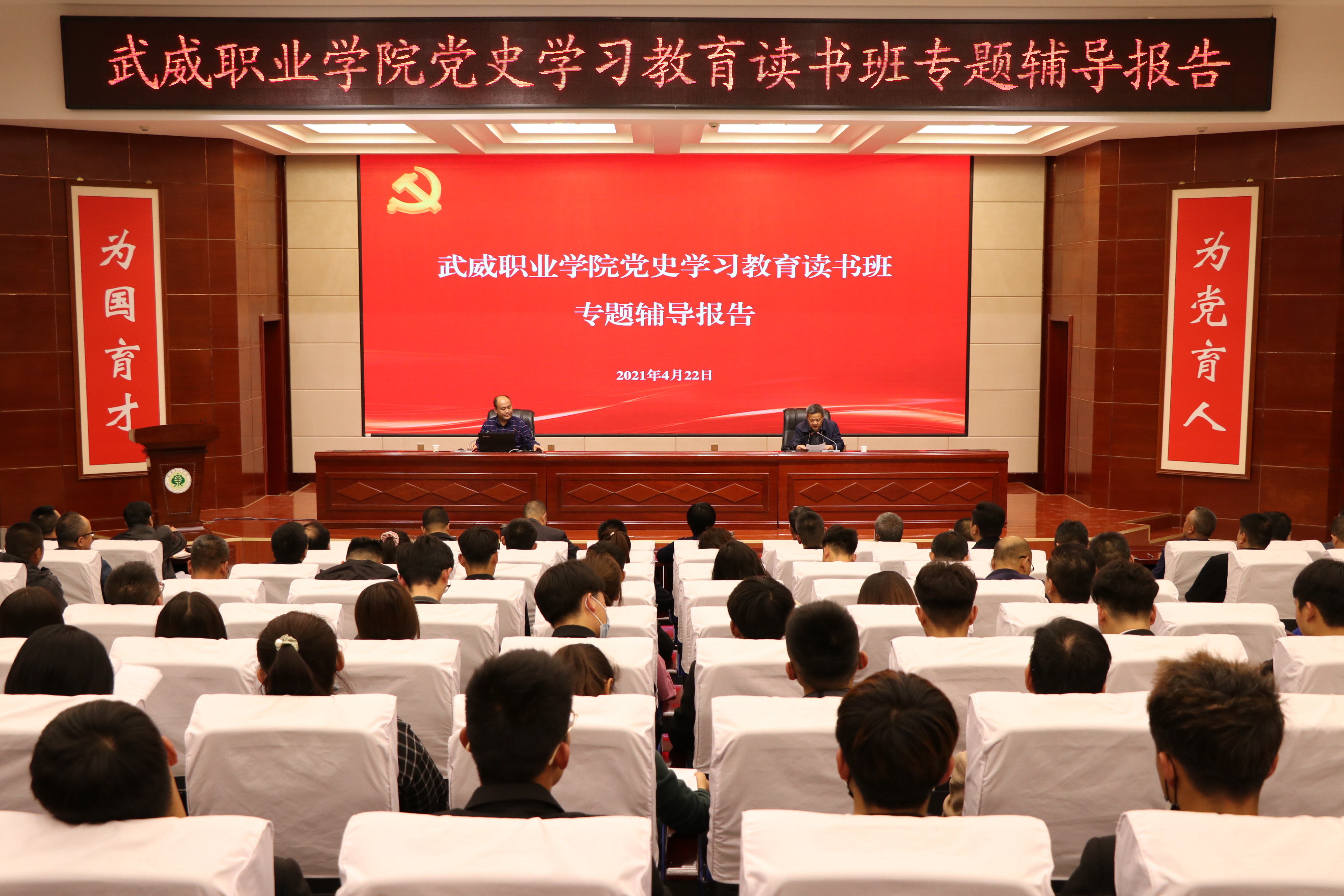 按照學院黨委理論學習中心組黨史學習教育讀書班安排,4月22日下午,讀書班邀請市委黨校講師、市黨史學習教育宣講團成員魏樂儀作黨史學習教育專題輔導報告。學院領導班子成員、全體中層干部、各基層黨組織書記、專職組織員、支委委員和師生代表共220人參加報告會。黨委書記、院長趙明主持報告會。
