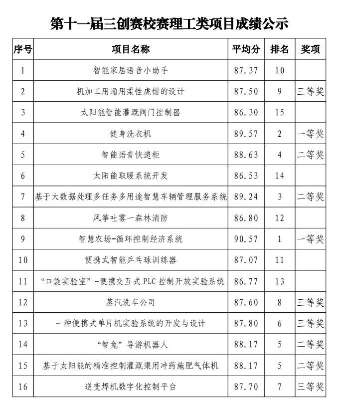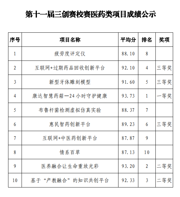 按照第十一屆三創(chuàng)賽省賽組委會要求,學(xué)院于4月24日在創(chuàng)新創(chuàng)業(yè)中心舉辦了校賽,經(jīng)學(xué)生團(tuán)隊申報、現(xiàn)場答辯及專家評審環(huán)節(jié),校賽已圓滿完成。按照校賽方案,一等獎不超過參賽隊數(shù)的 10%,二等獎不超過參賽隊數(shù)的 20%,三等獎不超過參賽隊數(shù)的 30%?,F(xiàn)將第十一屆三創(chuàng)賽校賽獲獎項目成績和獲獎名次予以公示,公示期三日。