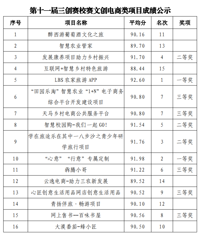 第十一屆三創(chuàng)賽武威職業(yè)學(xué)院校賽擬獲獎項目及成績公示
