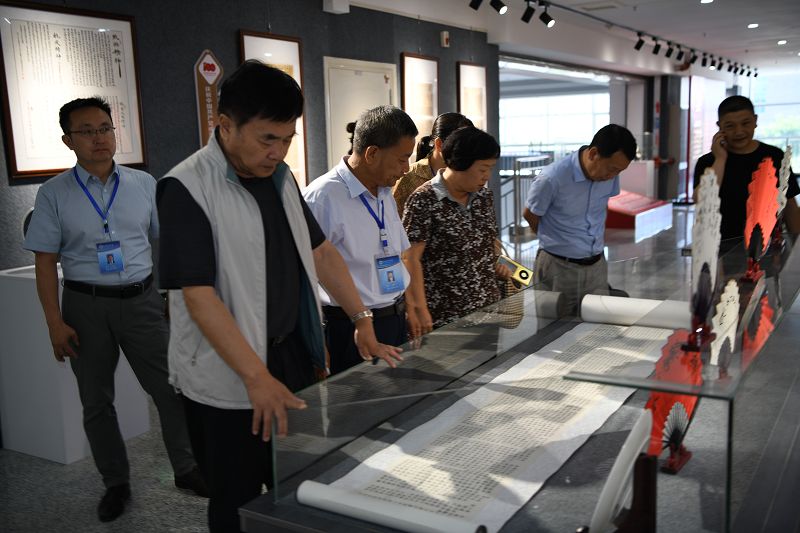 會后,考察組一行在學(xué)院領(lǐng)導(dǎo)的陪同下先后參觀考察了學(xué)院紅色文化藝術(shù)館、中華優(yōu)秀傳統(tǒng)文化藝術(shù)作品展,趙明向考察組做了詳細講解。