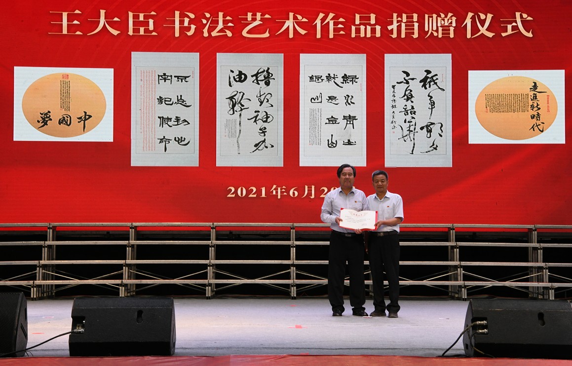之后舉行了王大臣先生書法藝術(shù)作品捐贈儀式,學(xué)院黨委書記、院長趙明教授為王大臣先生頒發(fā)《收藏證書》。王大臣先生自愿將140多件書法藝術(shù)作品無償捐贈給我們學(xué)院,給我們留下了寶貴的精神財富,讓作品中蘊含的紅色基因薪火相傳、血脈永續(xù)!