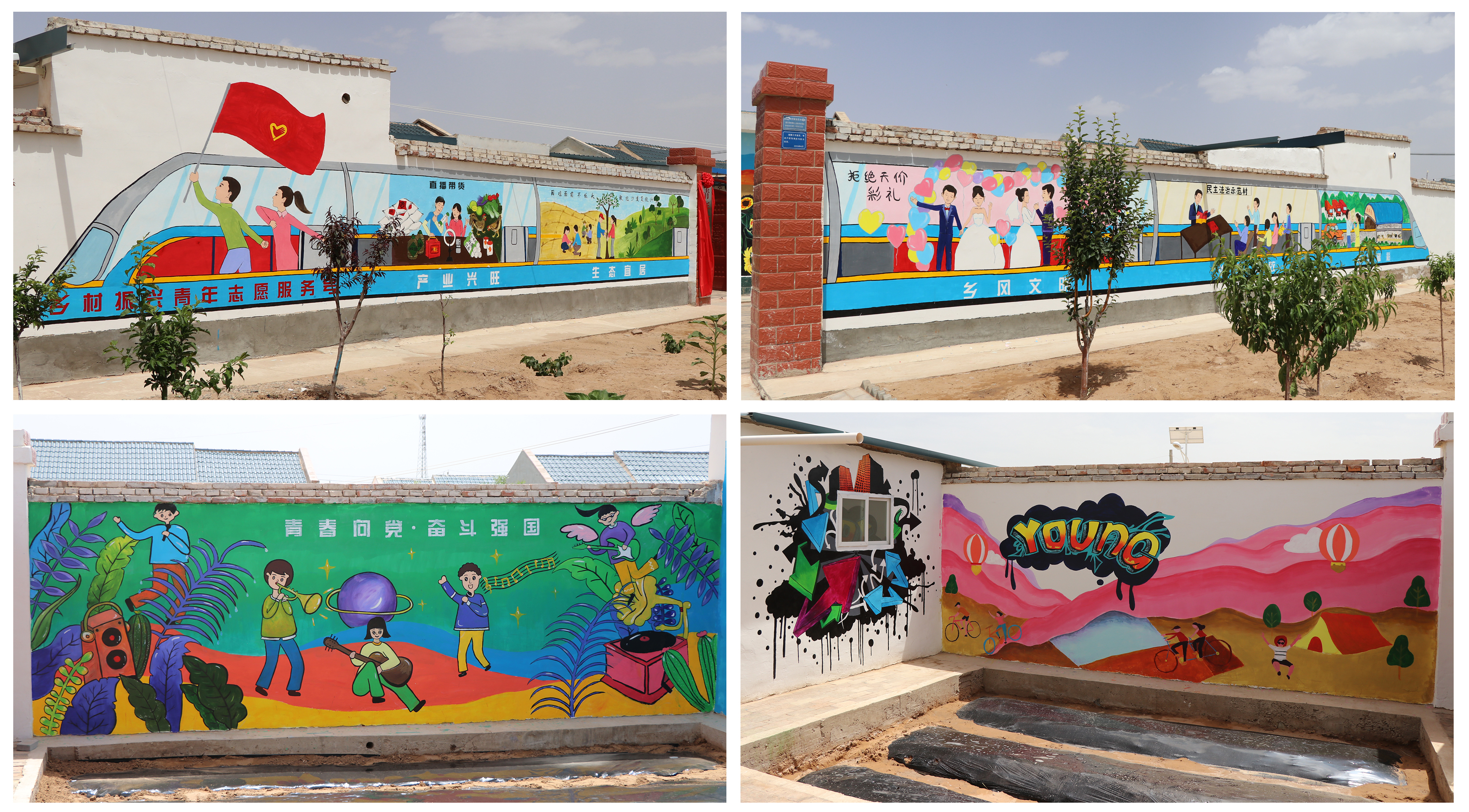 學(xué)院團(tuán)委結(jié)合鄉(xiāng)村振興戰(zhàn)略和青年志愿服務(wù)工作特點(diǎn)對(duì)基地內(nèi)外墻體進(jìn)行了彩繪設(shè)計(jì),并組織人文藝術(shù)教育系師生完成了手工繪制。外墻以鄉(xiāng)村振興青年志愿服務(wù)號(hào)高速列車為主題,融入了鄉(xiāng)村振興戰(zhàn)略20字方針,產(chǎn)業(yè)興旺、生態(tài)宜居、鄉(xiāng)風(fēng)文明、治理有效、生活富裕5個(gè)方面的總體目標(biāo)。內(nèi)墻以青春時(shí)尚為主題,利用涂鴉的形式,展現(xiàn)青年人朝氣蓬勃、積極向上,青春向黨、奮斗強(qiáng)國的精神風(fēng)貌。