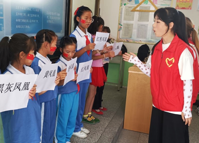 圖為實踐隊員正在和孩子們玩繞口令游戲