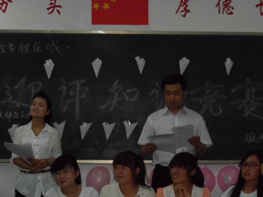 比賽開始前顏老師對本次評估工作向同學(xué)們提出了要求,同時表示了對此次競賽的充分肯定。比賽以“校園評估知識”為主題,共分為五個環(huán)節(jié)。當(dāng)主持人宣布第一環(huán)節(jié)“必答題”的比賽開始后,場上緊張激烈的較量便從未停止過,各位選手更是思維敏捷,回答嚴(yán)絲合縫。第二環(huán)節(jié)“是非題”各參賽隊緊追不舍,陣陣掌聲過后,迎來了第三環(huán)節(jié)“搶答題”的比賽,選手們以平時積累的大量知識和默契的配合征服了在場的所有人。在后兩個環(huán)節(jié)“風(fēng)險題”,和“選答題”中,有趣的知識,嚴(yán)密的思維被同學(xué)們展現(xiàn)的淋漓盡致,陣陣掌聲在教室經(jīng)久不息。