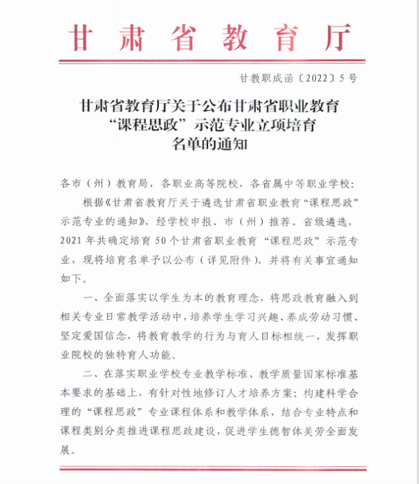 ? 近日,教育廳公布了2021年“技能甘肅”內(nèi)涵項目評審結(jié)果,中科低碳新能源技術學院申報的甘肅省職業(yè)教育“課程思政”示范專業(yè)、甘肅省職業(yè)教育在線精品課程、甘肅省職業(yè)教育名師工作室均獲評。
