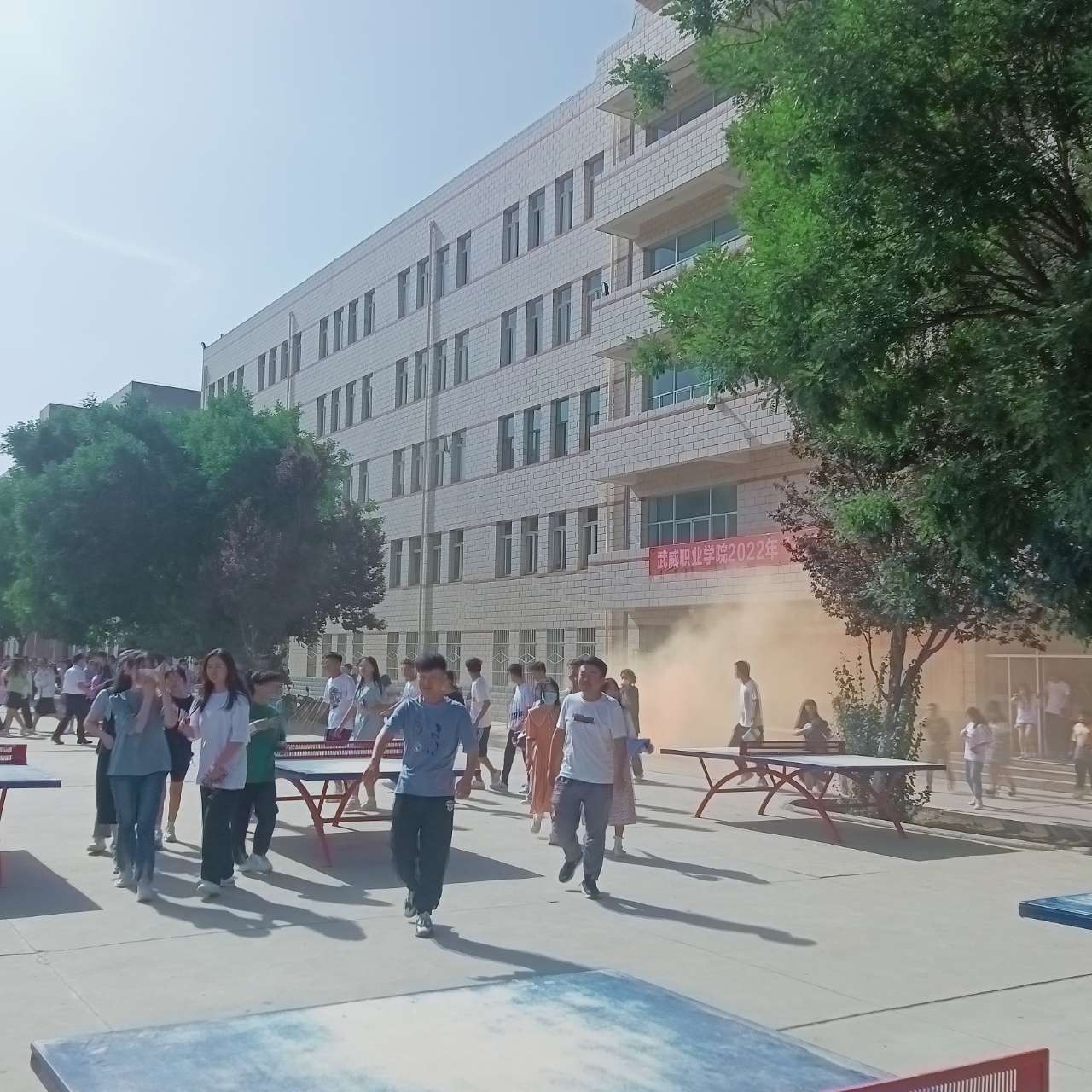 ? ?下午16:50隨著警報的響起,煙霧彈的點燃,上課老師組織學(xué)生疏散,各班學(xué)生在老師們的指揮下,按照指定路線,貓著腰,用手、袖口捂著嘴鼻迅速有序地進行緊急疏散,全體師生撤離到安全地帶。為保證所有同學(xué)安全撤離,學(xué)生會成員迅速清點了各班級人數(shù),并像楊老師匯報。