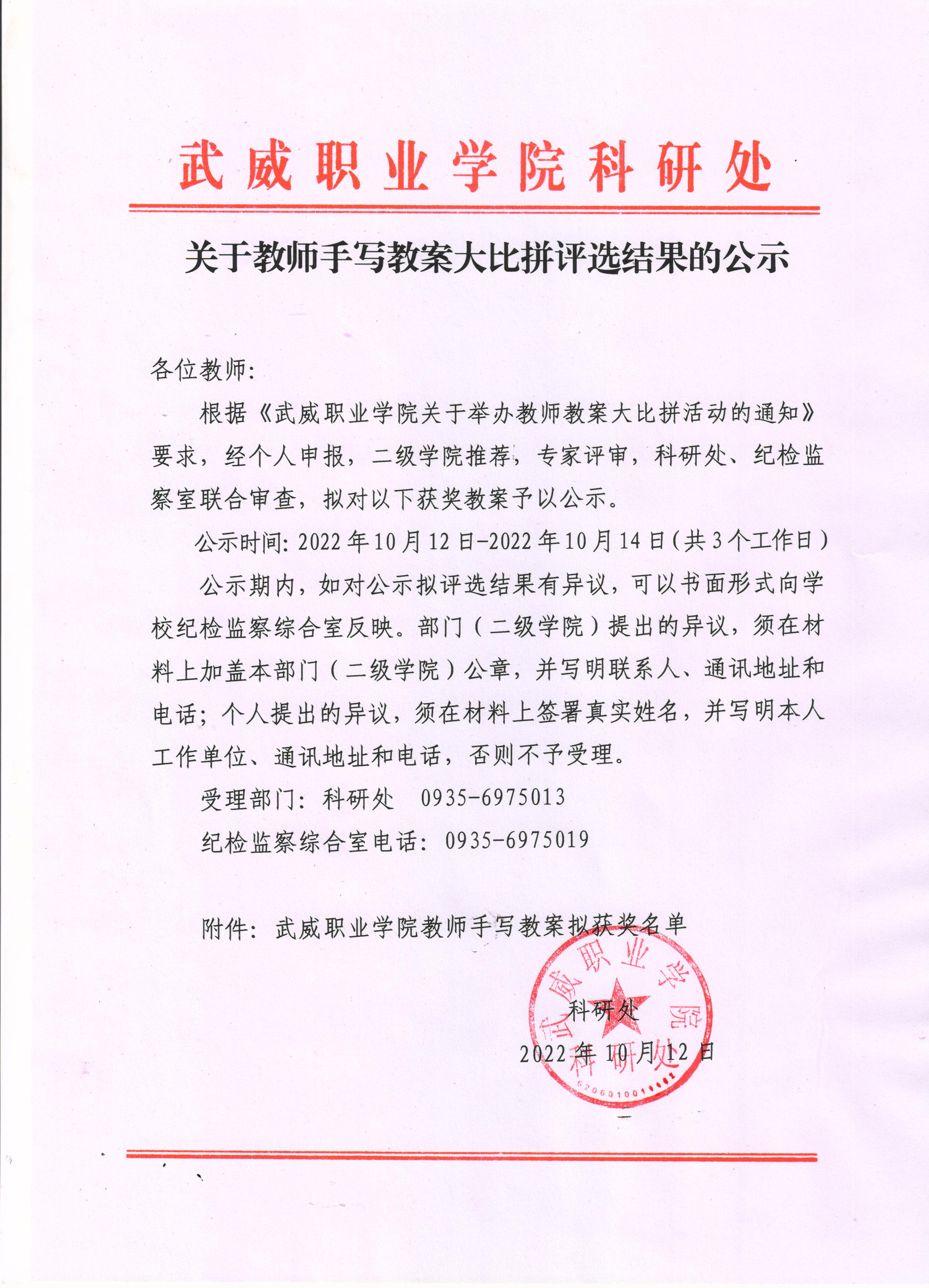 關(guān)于教師手寫教案打比賽評選結(jié)果的公示
