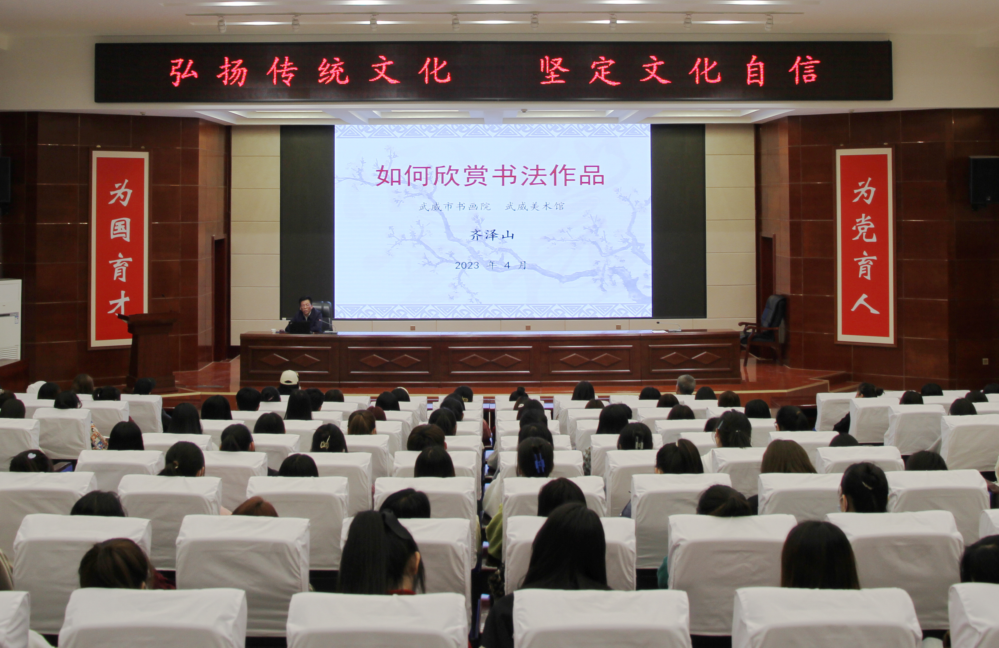 為進一步學習宣傳貫徹黨的二十大精神,推動學習貫徹習近平新時代中國特色社會主義思想主題教育走深走實,深入開展“三抓三促”行動,弘揚中華優(yōu)秀傳統(tǒng)文化,4月21日,學校邀請武威市書畫院(武威美術(shù)館)院長齊澤山一行7人來我校開展傳統(tǒng)文化進校園活動。學校黨委書記、校長趙明,副校長王守云出席活動。學校中國傳統(tǒng)文化體驗中心團隊教師、藝術(shù)與教育學院師生、志通書法協(xié)會全體會員、外國留學生等,共計200余人參加本次活動。