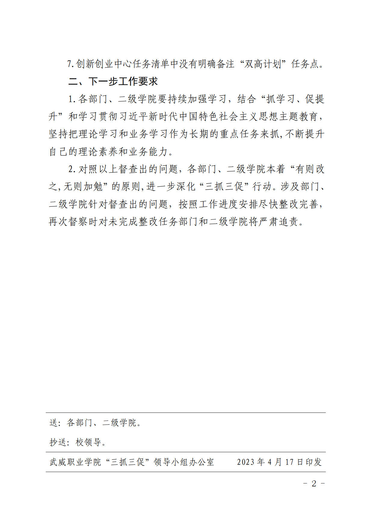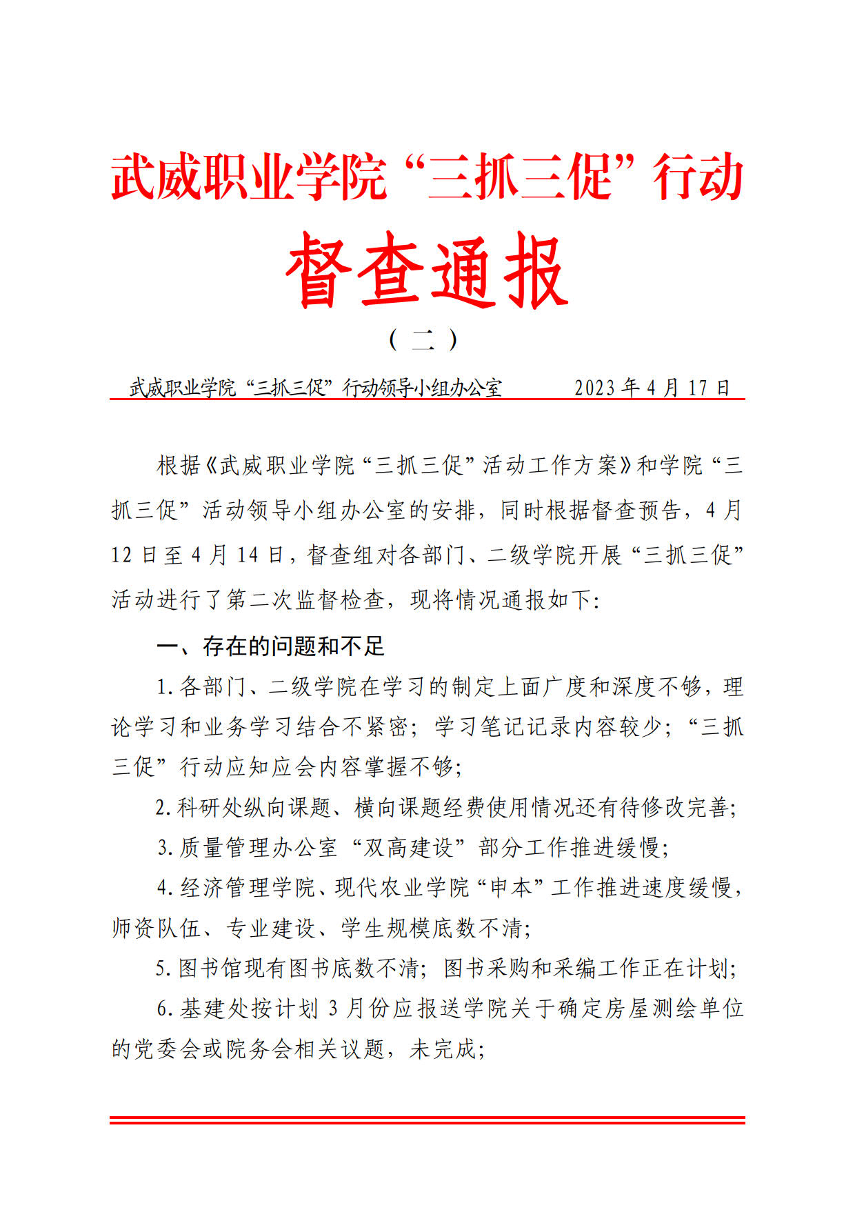 武威職業(yè)學院“三抓三促”行動督查通報( 二 )