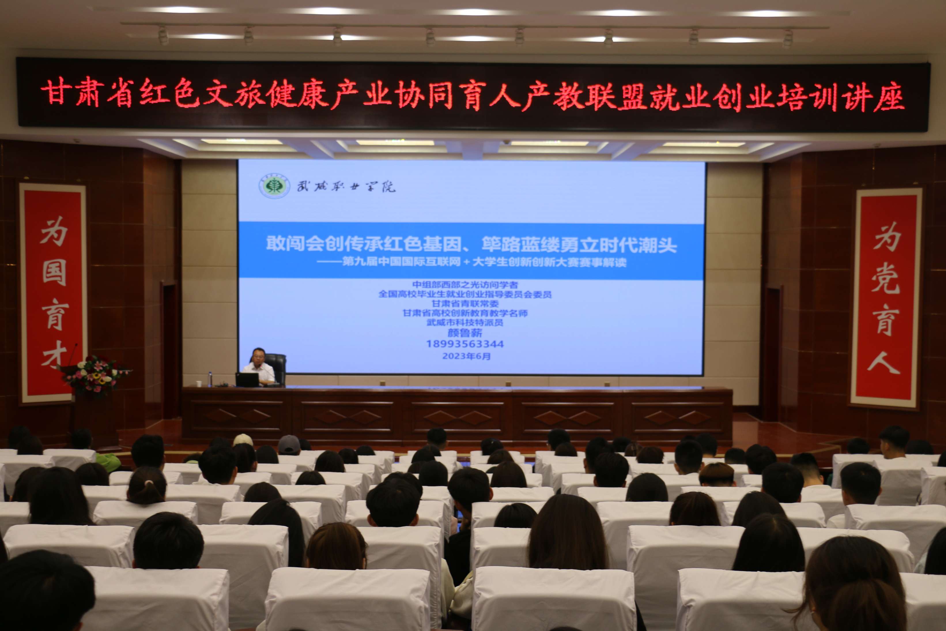 為了幫助學生準確有效地確定就業(yè)方向,盡快讓他們在思想上想、行動上早做準備,指導學生走好從大學走向社會的重要一步。6月7日,甘肅省人社廳人力資源市場檔案管理部部長姚力峰,甘肅省創(chuàng)新創(chuàng)業(yè)教育教學名師、武威職業(yè)學院教授顏魯薪主講的就業(yè)創(chuàng)業(yè)培訓講座在學校菁英廳順利舉行,學校220余名師生代表參加。