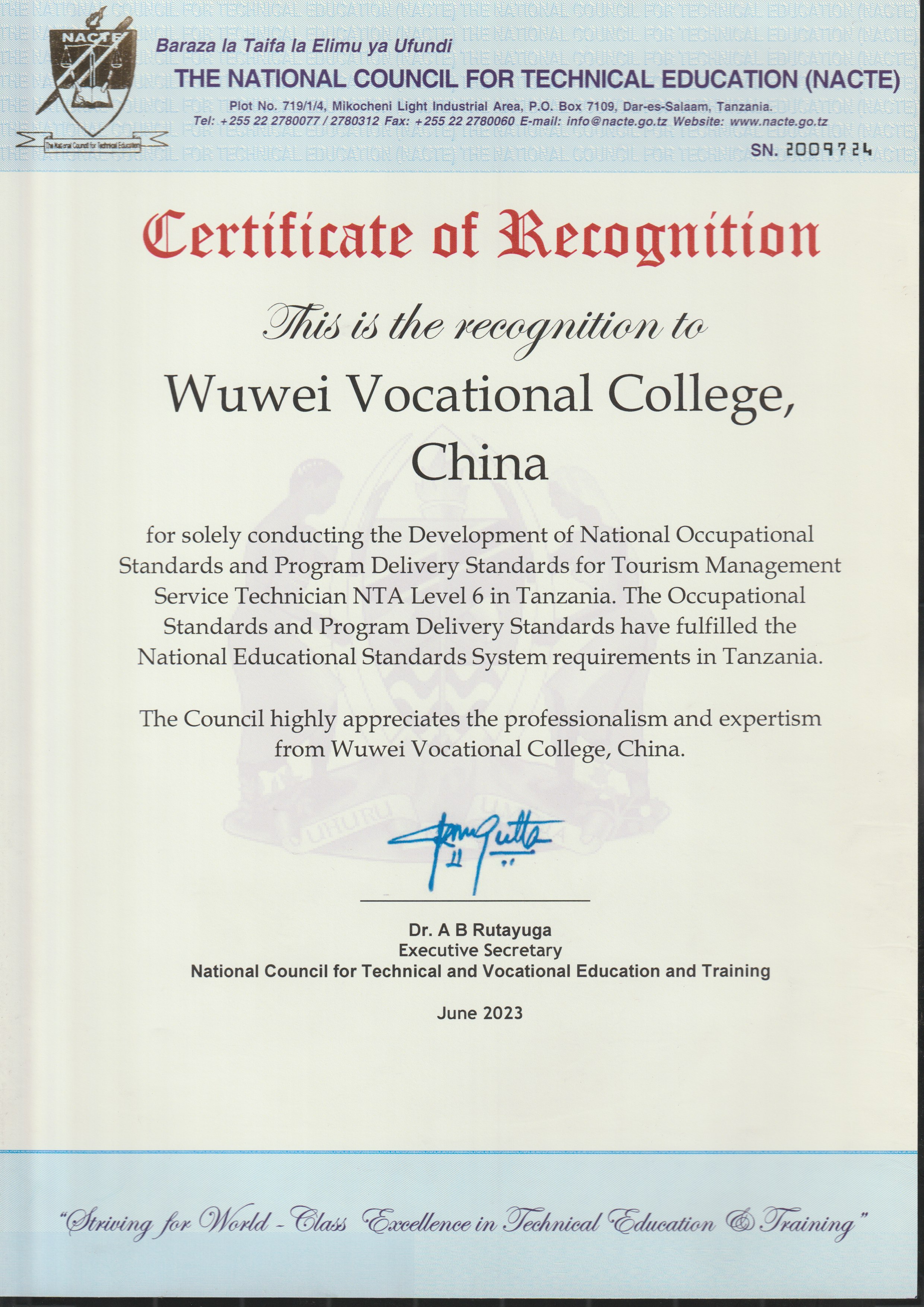 6月16日,學(xué)校獨(dú)立開發(fā)制定的旅游管理服務(wù)技術(shù)員6級(jí)職業(yè)標(biāo)準(zhǔn)和配套專業(yè)教學(xué)標(biāo)準(zhǔn)通過了坦桑尼亞國(guó)家職業(yè)教育委員會(huì)審核,獲得認(rèn)證,正式納入坦桑尼亞國(guó)家職業(yè)教育體系。旅游管理服務(wù)技術(shù)員6級(jí)職業(yè)標(biāo)準(zhǔn)和配套專業(yè)教學(xué)標(biāo)準(zhǔn)由學(xué)校經(jīng)濟(jì)管理學(xué)院旅游管理專業(yè)教師許春華、占發(fā)禹、張語悅、王美婕、閆亞旗、劉金萍六位教師共同開發(fā)制定。