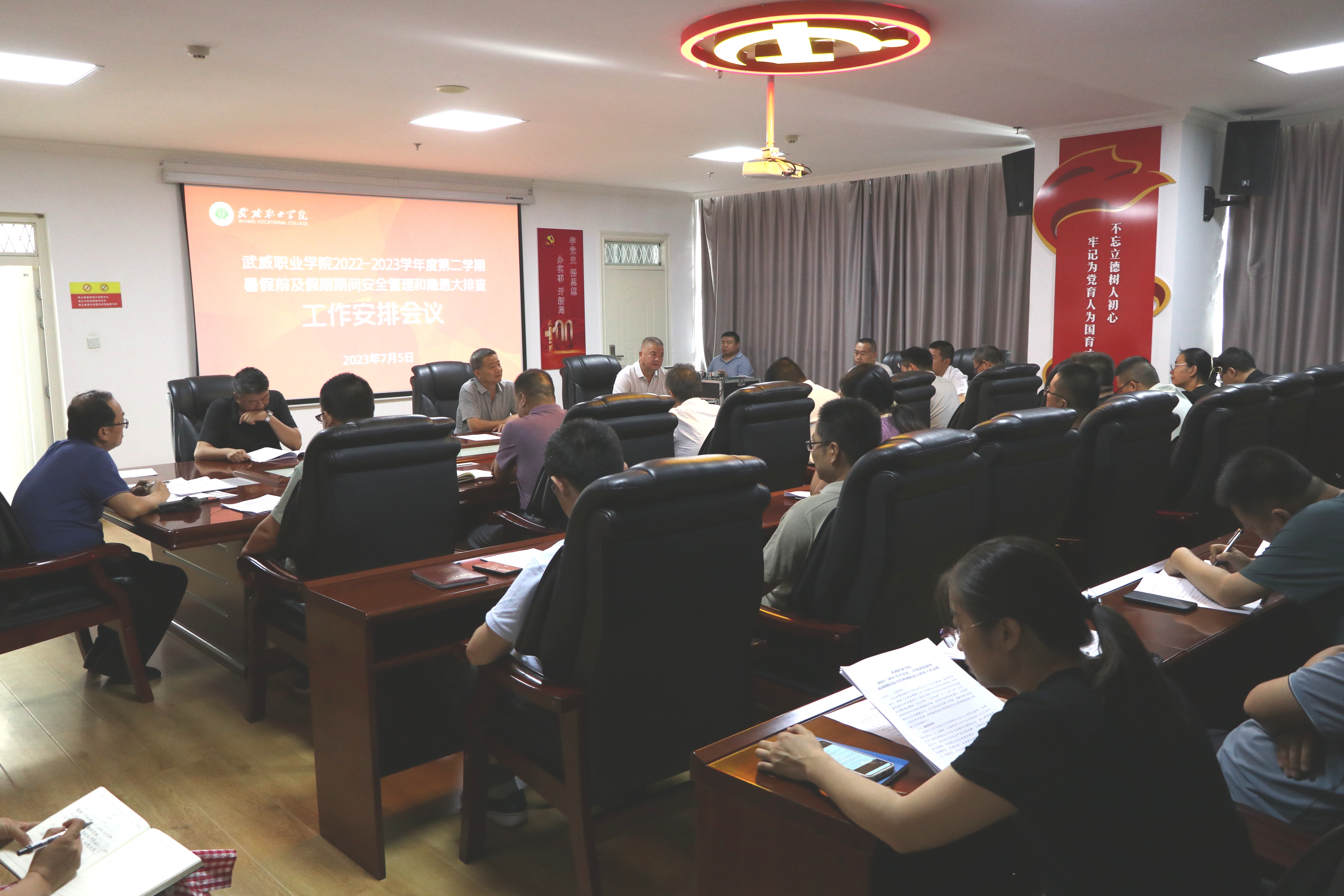 王守云傳達(dá)了《甘肅省教育廳關(guān)于加強(qiáng)職業(yè)學(xué)校安全管理工作的緊急通知》精神。分析研判了學(xué)校當(dāng)前學(xué)生安全教育管理面臨的形勢,并安排部署了武威職業(yè)學(xué)院2022至2023學(xué)年第二學(xué)期暑假前及暑假期間安全管理及安全隱患大排查工作。
