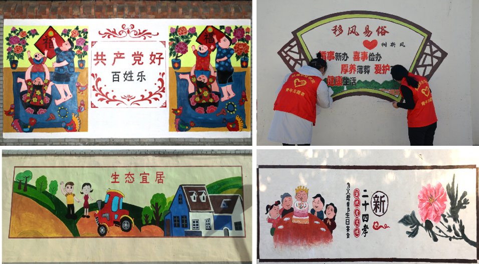 自2019 年以來,武威職業(yè)學(xué)院堅持“立足地方、融入地方、服務(wù)地方”的發(fā)展理念,將優(yōu)勢學(xué)科專業(yè)與武威市經(jīng)濟社會發(fā)展緊密結(jié)合,組織師生開展“打造人文美居助力鄉(xiāng)村振興”墻體彩繪志愿服務(wù)項目,通過墻體彩繪反映黨的領(lǐng)導(dǎo)下農(nóng)村精神風貌的變化和取得的成就,將村莊重點街巷屋面墻體繪制出一幅幅反映美麗鄉(xiāng)村建設(shè)、社會主義核心價值觀、移風易俗、鄉(xiāng)風文明等為主題的墻體畫,形象生動、 通俗易懂的內(nèi)容讓村民變“被動學(xué)”為“主動看”,不僅展現(xiàn)了農(nóng)村新生活、農(nóng)業(yè)新氣象、農(nóng)民新面貌,美化了村容村貌,為美麗鄉(xiāng)村建設(shè)、人居環(huán)境美化添磚加瓦。