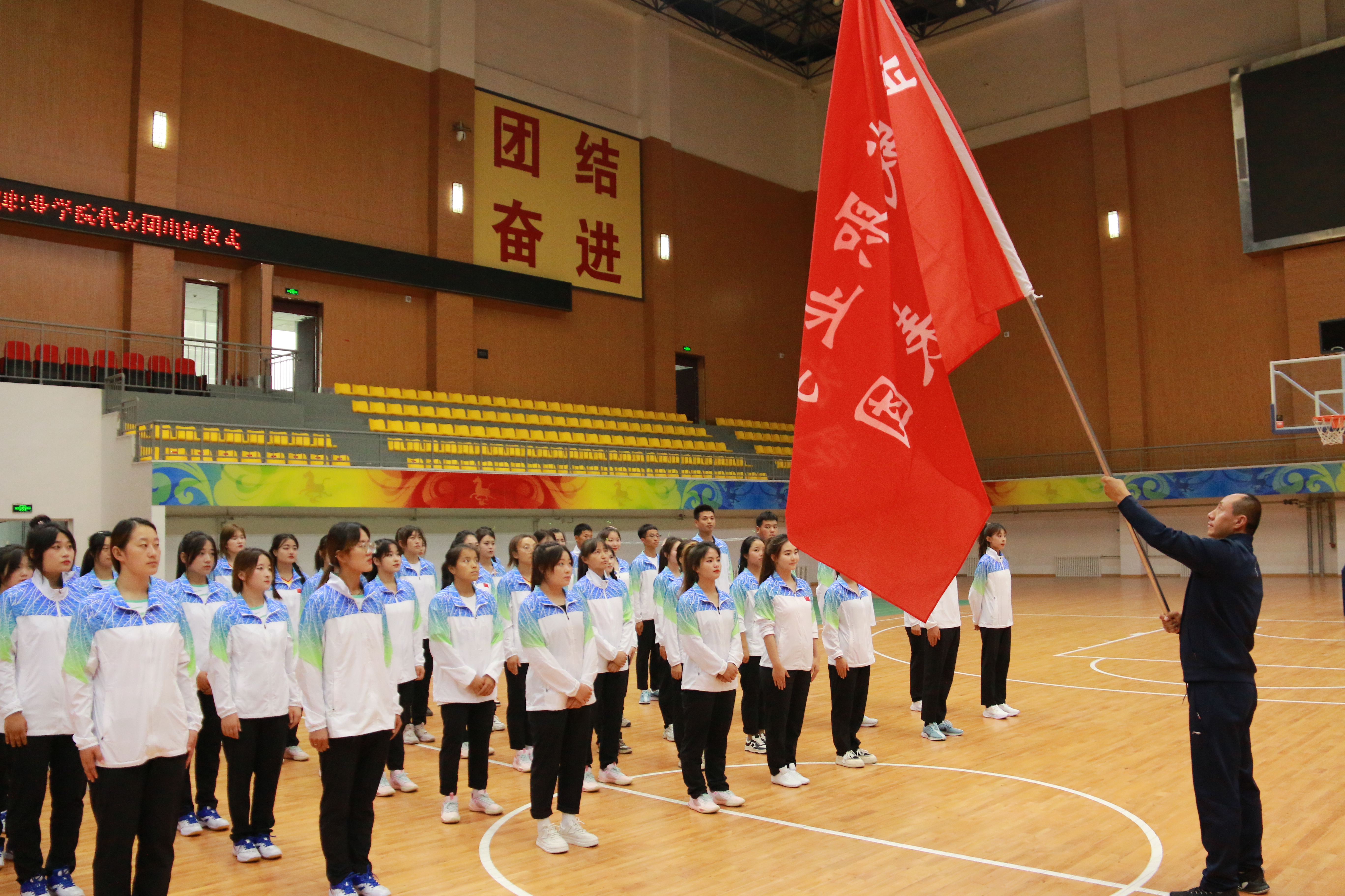 隨后,王守云向?qū)W校大運會代表團授旗。