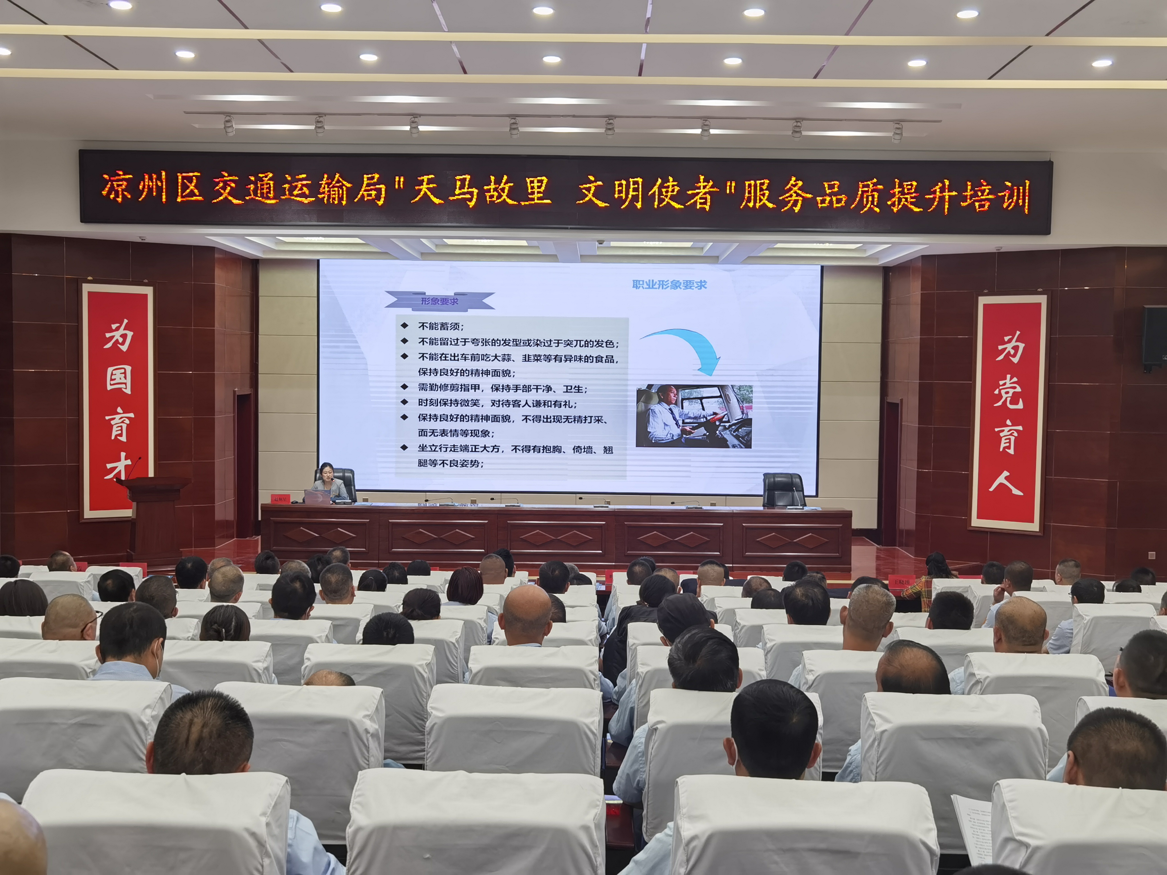 6月28日,“天馬故里 文明使者”客運企業(yè)從業(yè)人員服務品質提升培訓班在武威職業(yè)學院開班。市交通局副局長柴天祥,區(qū)委常委、統(tǒng)戰(zhàn)部部長、區(qū)政協(xié)黨組書記許娜,市交通運輸綜合行政執(zhí)法隊隊長韓世泰,市運管局副局長許培明,學校黨委委員、副校長王守云出席開班儀式。開班式由涼州區(qū)交通運輸局副局長蘇銀堂主持,出租客運公司、城市公交公司和定制客運公司管理人員及從業(yè)人員220人參加開班儀式。