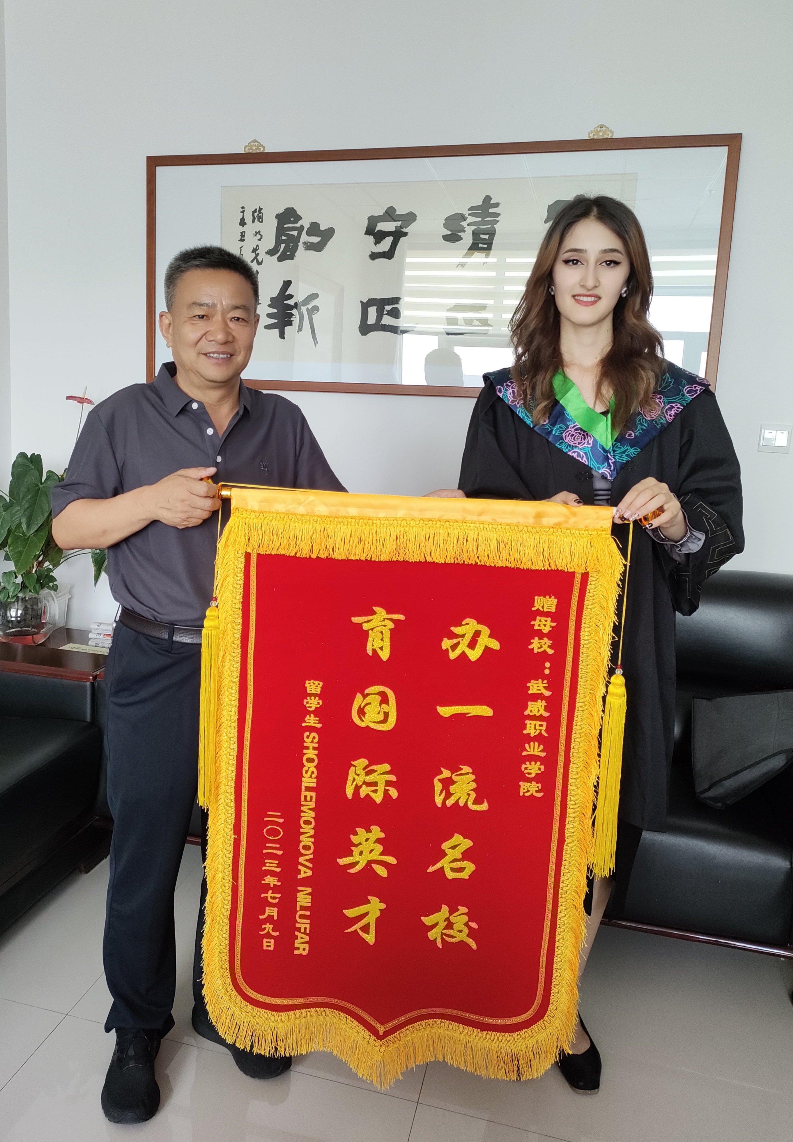 國際學(xué)生HOSILEMONOVA NILUFAR(妮娜)向?qū)W校贈送“辦一流名校 育國際英才”的感謝旌旗,對學(xué)校精心、悉心培養(yǎng)自己表達了由衷的感謝,表示在武威職業(yè)學(xué)院收獲了專業(yè)技能和人生閱歷,接觸到了先進技術(shù)技能和前沿思想,特別是通過學(xué)習(xí)中國文化,深刻認識到文化交流的重要性,也更加堅定了自己繼續(xù)學(xué)習(xí)中文和中國文化的決心。