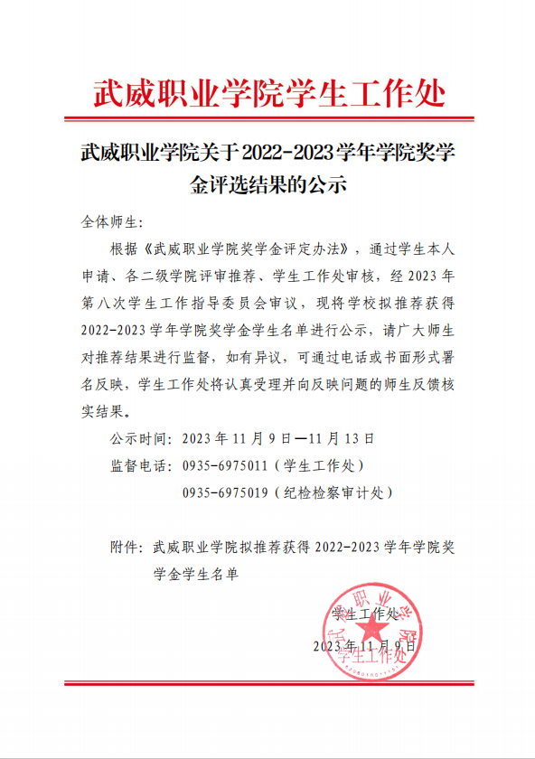武威職業(yè)學(xué)院關(guān)于2022-2023學(xué)年學(xué)院獎(jiǎng)學(xué)金評選結(jié)果的公示