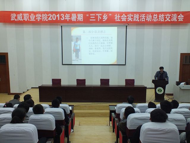 10月14日下午,武威職業(yè)學(xué)院2013年暑期“三下鄉(xiāng)”社會實(shí)踐活動總結(jié)交流會在東階梯教室舉行,學(xué)院團(tuán)委負(fù)責(zé)人及各實(shí)踐團(tuán)隊成員和新生團(tuán)學(xué)干部代表共300人參加了交流會。