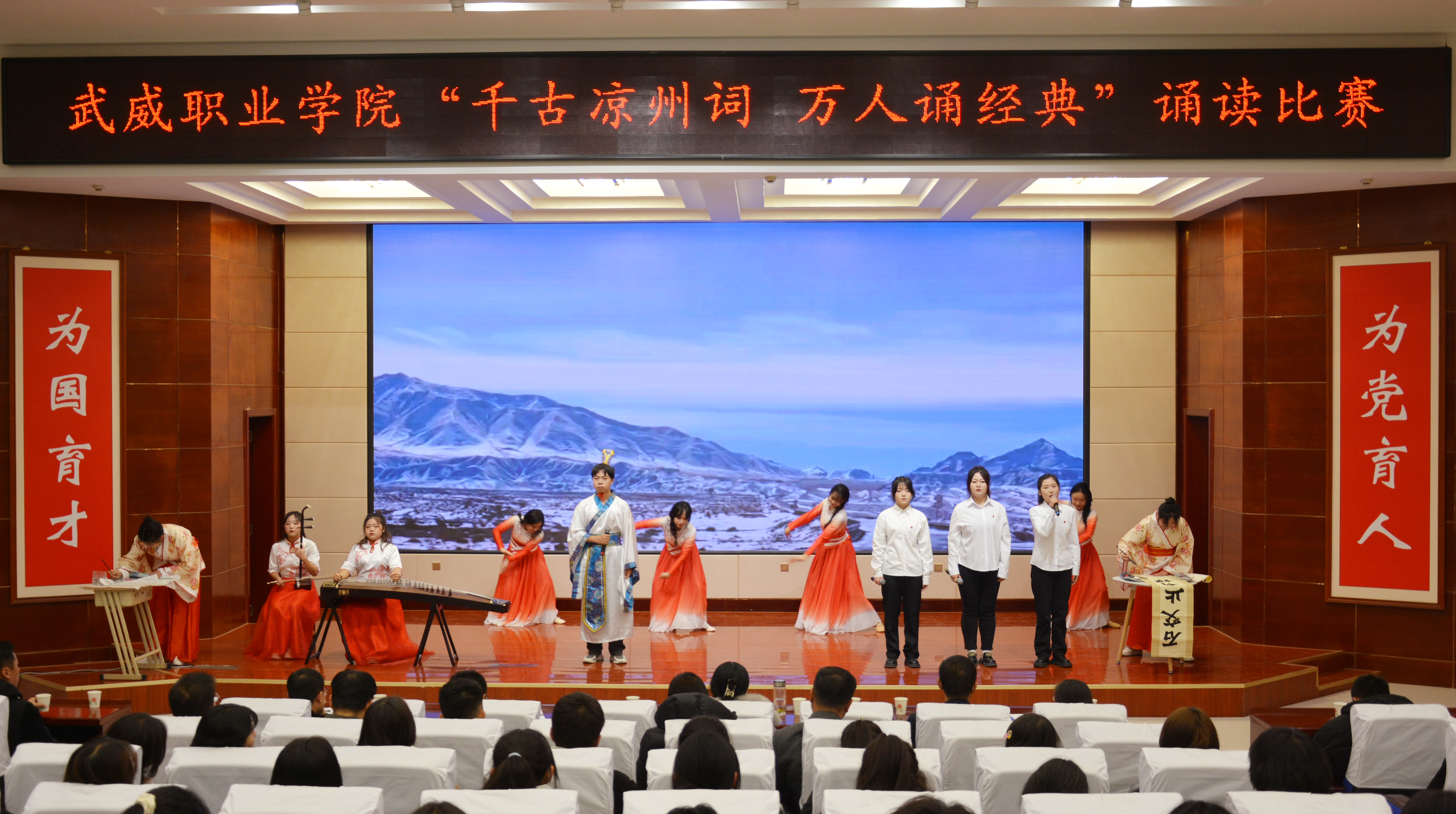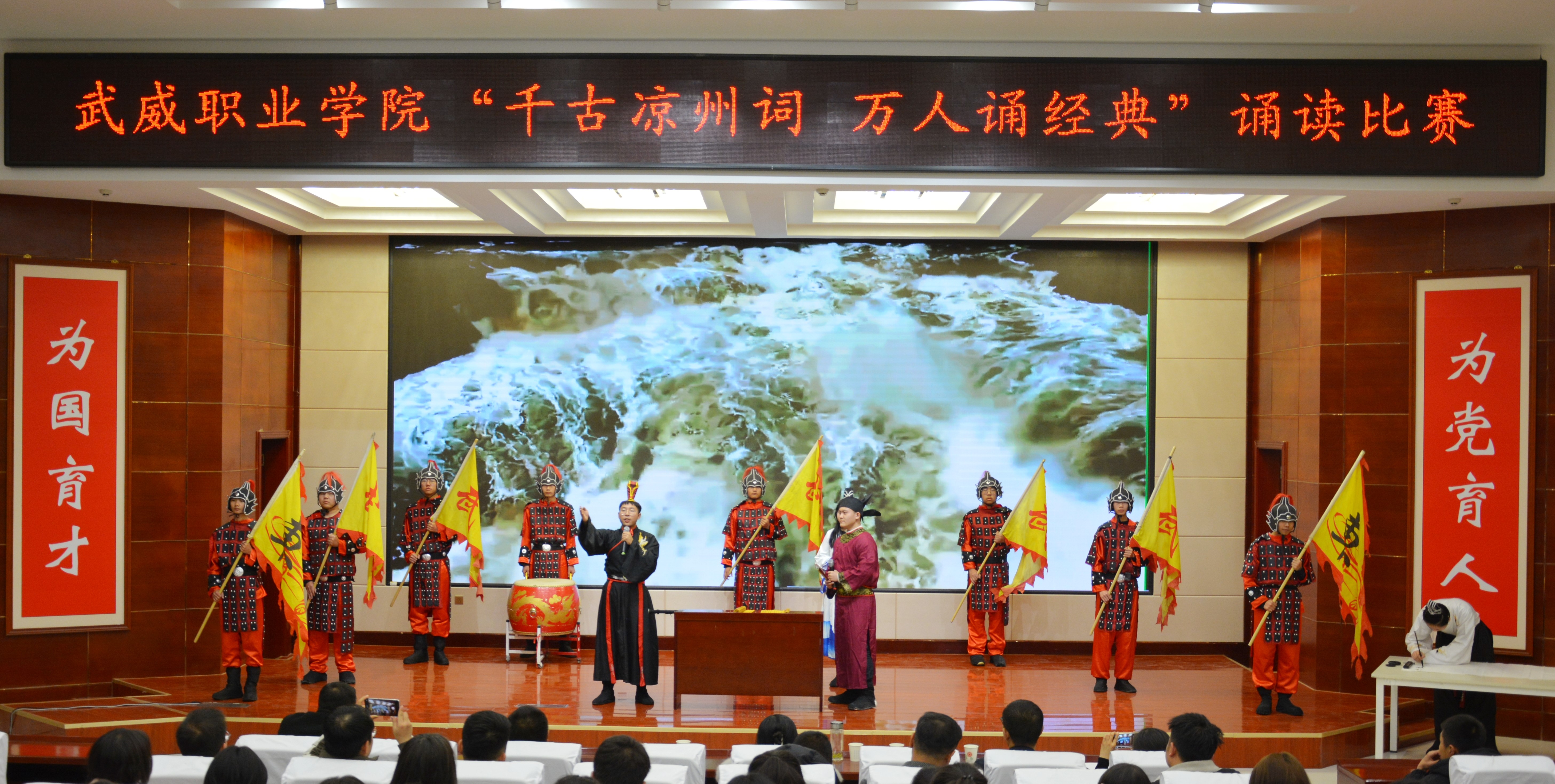比賽現(xiàn)場精彩紛呈,現(xiàn)場氣氛異常熱烈,掌聲此起彼伏。節(jié)目以詩歌吟誦、伴舞、書法、國畫、武術、情景表演等豐富多彩的藝術形式,為現(xiàn)場觀眾打造出一場別開生面的涼州文化視聽盛宴。同學們激情洋溢,用澎湃真摯的情感演繹著經典燦爛的磅礴詩篇,用跨越千年的對話勾勒出雄渾壯烈的漢武雄風,用鏗鏘有力的旋律編織出蕩氣回腸的時代頌歌,以青春奮斗的初心賡續(xù)著生生不息的五涼文化。